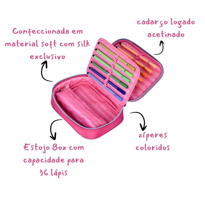 Conteúdo da embalagem: 1 mochila, 1 estojo box, 1 bolsinha, 1 chaveiro