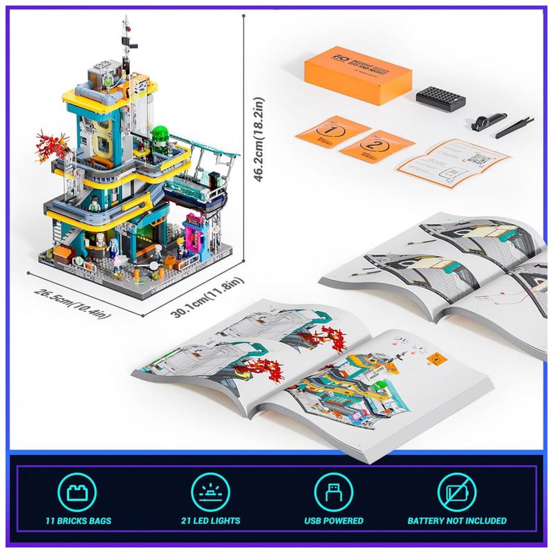 Conjunto de blocos de montar em plástico que representa um edifício residencial futurista em estilo cyberpunk, com múltiplos níveis, passarelas, letreiros e painéis em tons de azul e roxo. A construção simula apartamentos em um quarteirão de cidade do futuro, com fachadas cheias de tubulações aparentes, placas luminosas e módulos externos.?