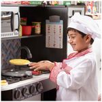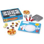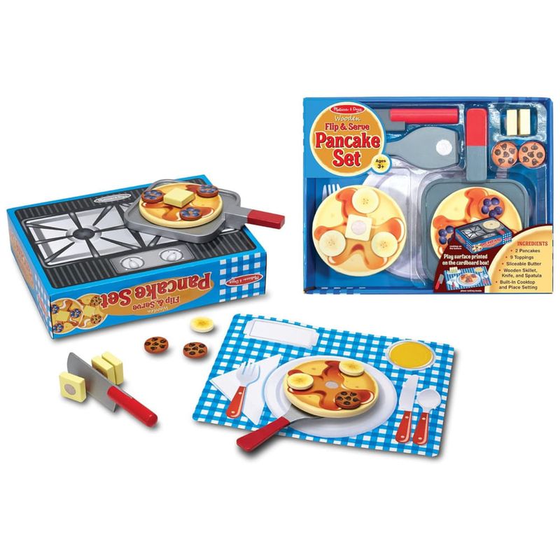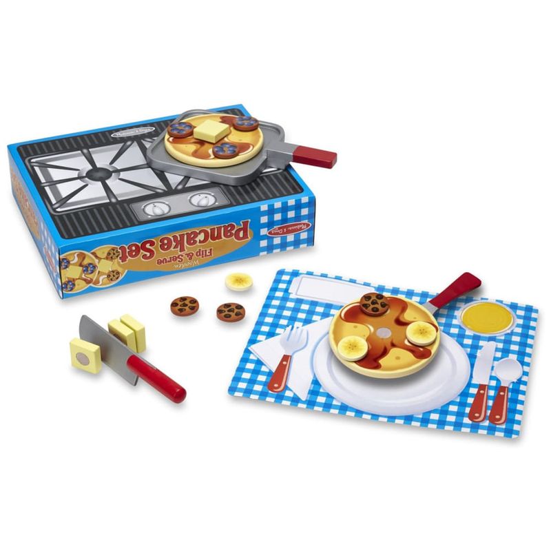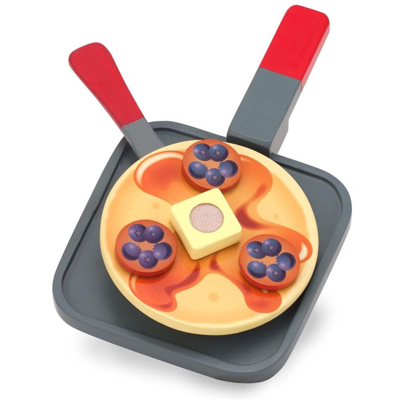 O conjunto inclui 2 panquecas, 9 discos de cobertura, 4 pedaços de manteiga, frigideira, faca, espátula e talheres de papel impresso. Todos os itens alimentares e utensílios apresentam construção de madeira resistente e a superfície do cooktop é impressa na parte de trás da caixa de armazenamento de papelão ondulado resistente. Além de proporcionar horas de diversão, o conjunto ajuda a ensinar a forma básica reconhecimento, sequenciamento e habilidades matemáticas iniciais, promovendo a coordenação olho mão, habilidades motoras finas, expressão criativa e brincadeiras imaginativas.