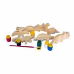 São 7 peças em madeira de reflorestamento, 6 cores de tinta atóxica e pincel para colorir