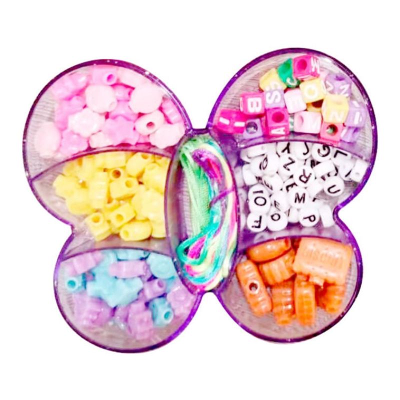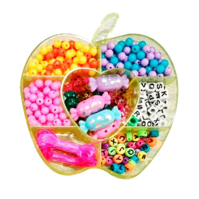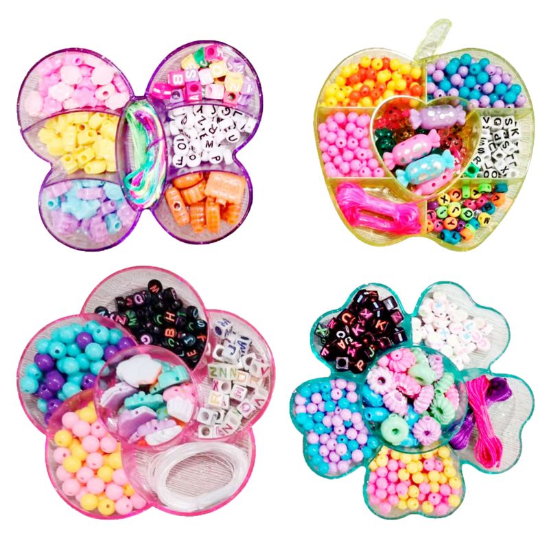 Este lindo Kit de Miçangas está disponível em 3 estojos com formatos e conteúdos sortidos (vendidos separadamente) para as crianças criarem as mais variadas bijuterias.