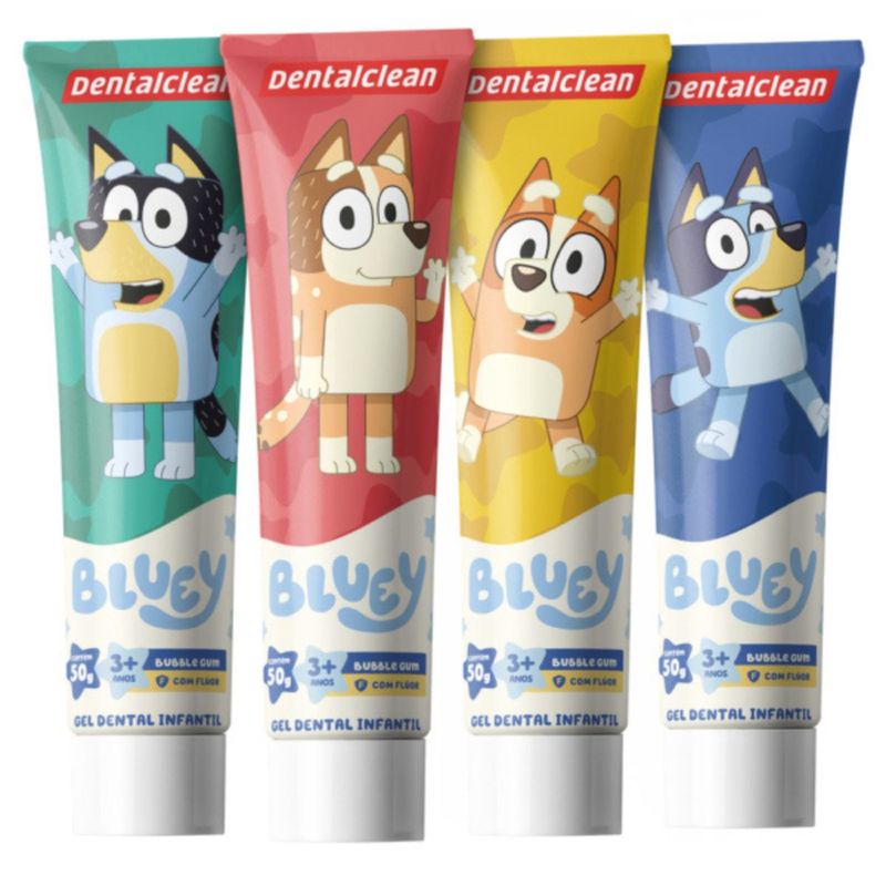 Gel Dental Bluey Premium 50 g: Um gel com sabor de bubble gum, formulado com 1.100 ppm de flúr, ideal para proteger contra cáries enquanto mantém o hálito fresco. A textura suave e a embalagem colorida tornam a escovação um momento agradável.