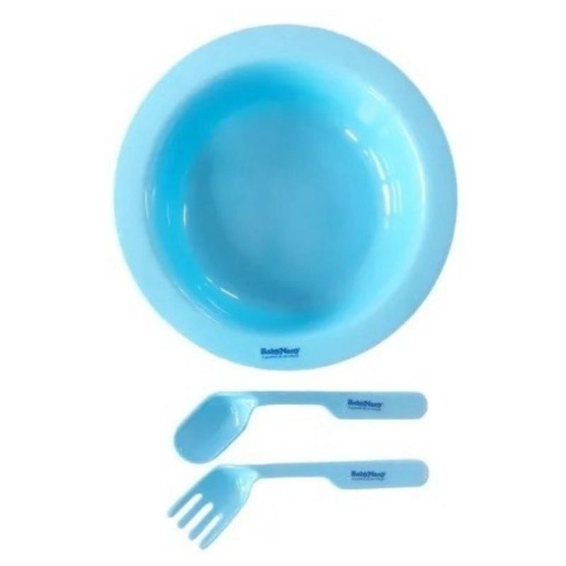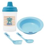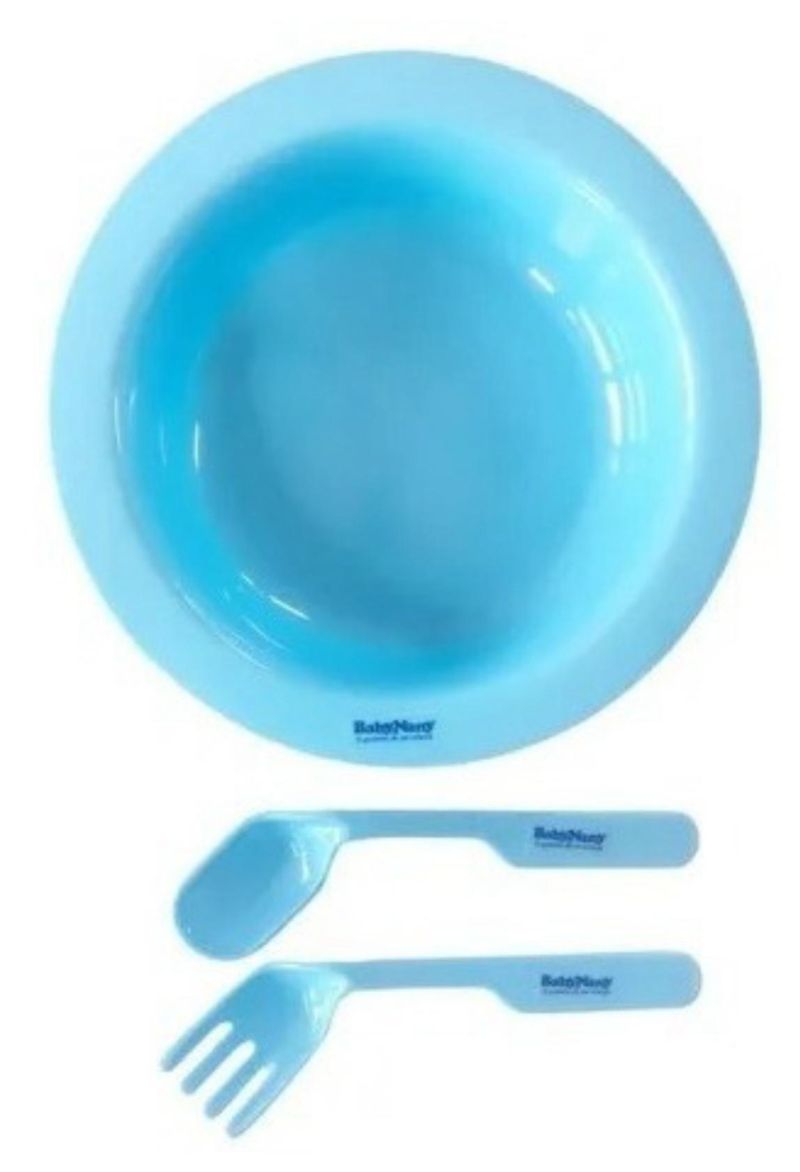 O kit de alimentação inclui um prato, garfo, colher e copo de suco.