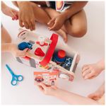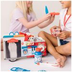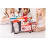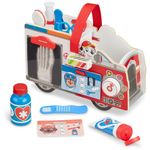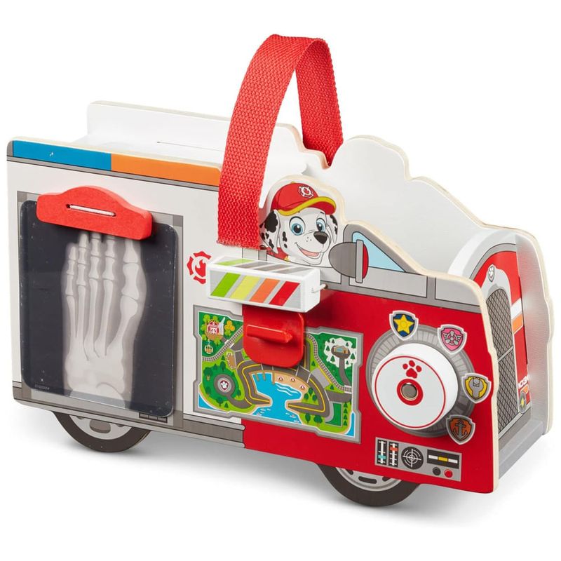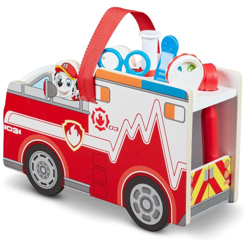 O transportador de madeira em forma de caminhão de resgate Marshalls PAW Patrol é um conjunto de primeiros socorros com 14 peças essenciais para qualquer missão de resgate. Com um cartão de missão preso na lateral do transportador, as crianças podem virar o bloco para mostrar o nível de emergência e girar o botão para escolher o crachá de um filhote para ajudar. As ferramentas EMT incluem um termômetro rolante, uma seringa, um frasco de remédio, bandagens, pinças, tesouras e um tubo de pomada.
