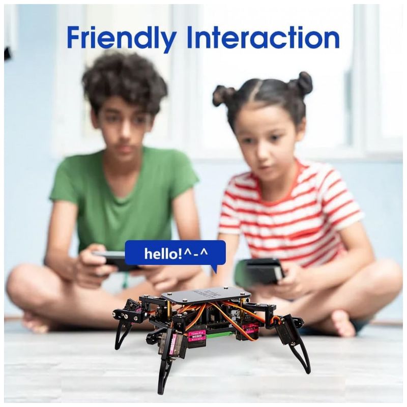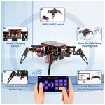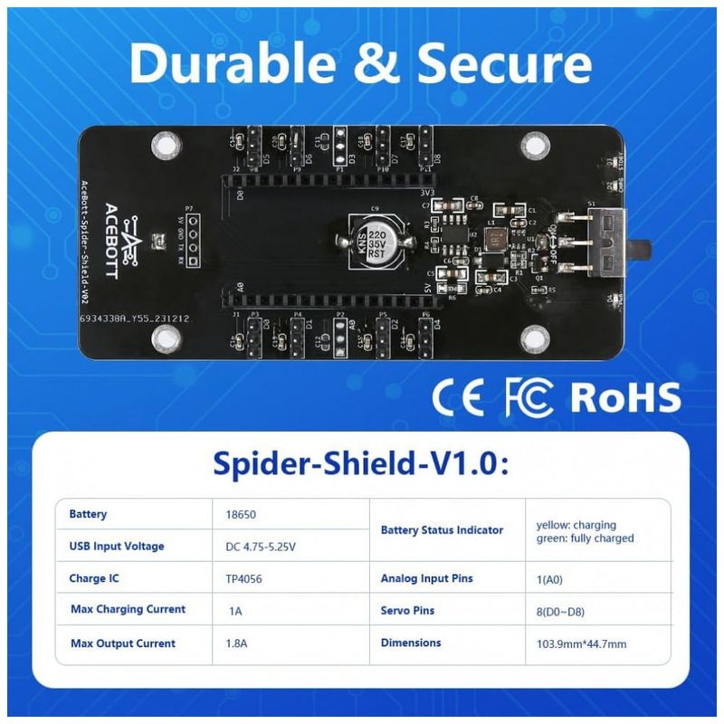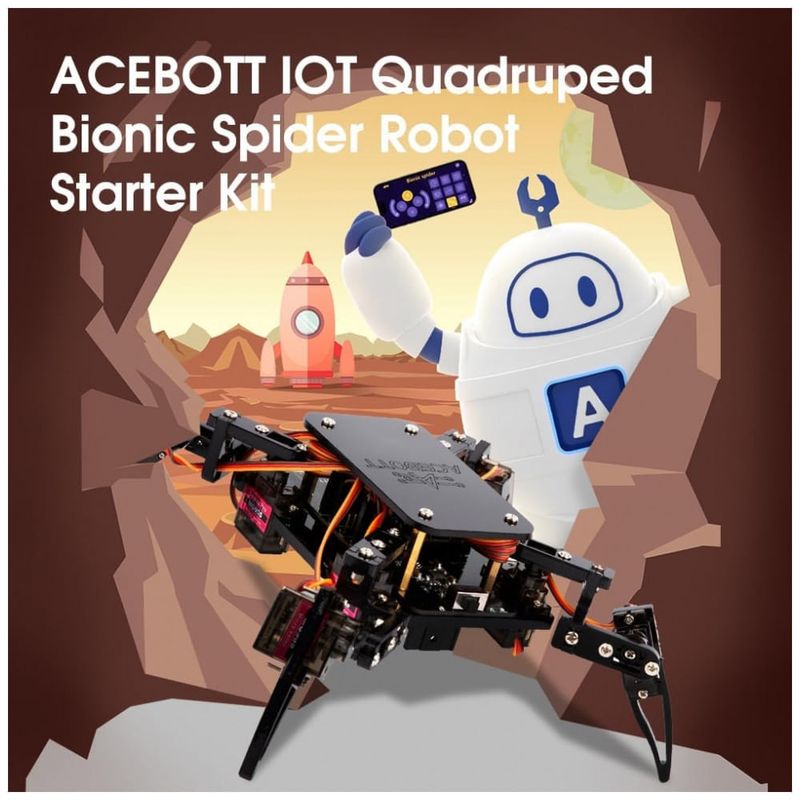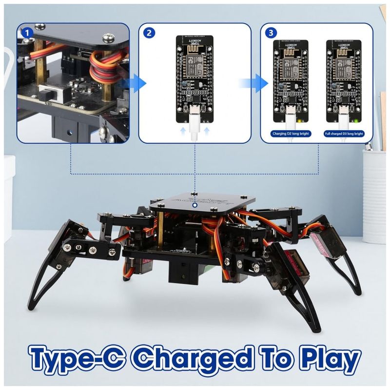 O ACEBOTT Spider Robot Building Kit QD020 é um kit educativo de robótica que utiliza uma placa baseada em ESP8266 e servos MG90 com engrenagens metálicas para montar um robô aranha articulado com movimentos de rastejo. O conjunto inclui estrutura mecânica, parafusos padronizados e eletrônica dedicada, com 6 modos de movimento e 9 ações pré-configuradas que podem ser controladas por aplicativo, oferecendo uma experiência prática de programação e controle de robôs. O robô possui recarga direta via USB-C e utiliza uma bateria recarregável do tipo 18650 (não incluída), o que amplia o tempo de uso contínuo em atividades de aula ou projetos em casa.
