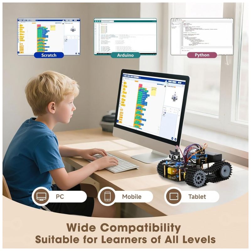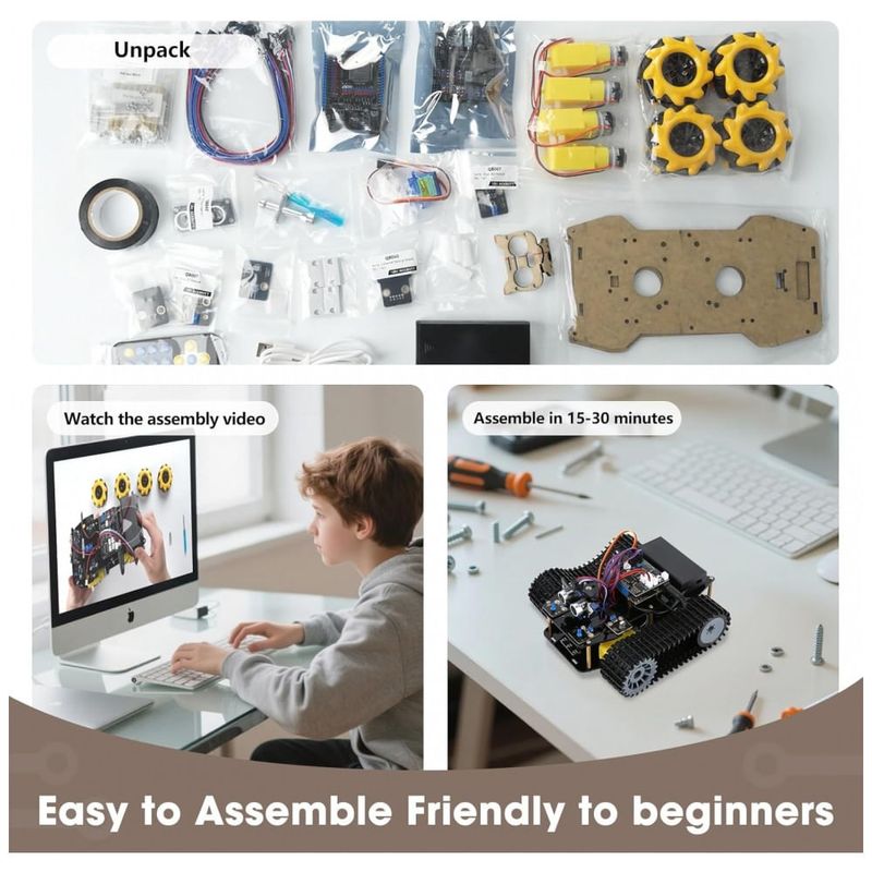 O ACEBOTT Smart Robot Tank Car QD034 é um kit educativo de robótica com tração por esteiras de borracha, projetado para exploração em diversos tipos de terreno, incluindo grama, cascalho, rampas e carpetes, oferecendo boa estabilidade e aderência para navegação em ambientes internos e externos. Baseado em controlador ESP32 compatível com Arduino IDE e Scratch, o kit inclui 16 tutoriais guiados e recursos on-line que introduzem programação, eletrônica e mecânica para estudantes entre 8 e 16 anos. A experiência de montagem utiliza peças padronizadas, ferramentas simples e vídeos em alta definição, favorecendo atividades em família e desenvolvimento de confiança e trabalho em equipe.