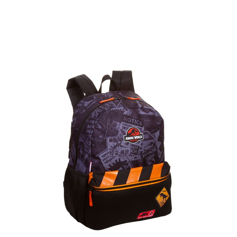 Mochila Jurassic produzida em poliéster com apliques, logo emborrachado, bolso frontal com zíper, bolso lateral em mesh com elástico e identificador no verso.