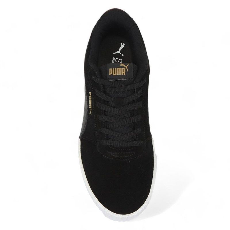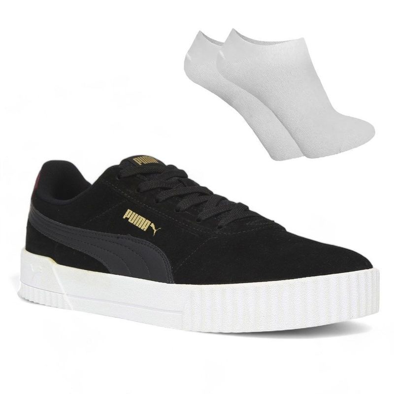 Com o Tênis Puma Carina BDP Feminino seu visual esportivo casual ganha classe e estilo. O modelo possui cabedal em camurça, oferecendo uma textura macia e confortável. O interior forrado e acolchoado conta com palmilha com tecnologia Softfoam que prolonga a sensação de conforto. O fechamento por cadarço promove melhor ajuste. Conta ainda com solado em borracha para maior aderência em diversos tipos de superfícies. Design em preto com a icônica faixa da Puma nas laterais e detalhes em vinho. Já as meias, são confeccionadas em algodão, poliamida e elastano, além de gerar comodidade, elas se ajustam perfeitamente aos pés. O modelo sapatilha com barra elástica canelada proporciona segurança para não descer. Além disso, o calcanhar e as pontas, possuem costura com reforço garantindo a durabilidade. O tamanho da meia acompanha a numeração do tênis. Referência: 375564.54