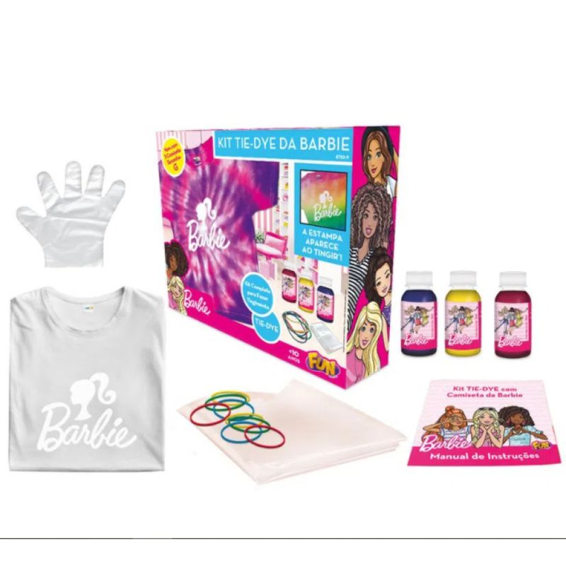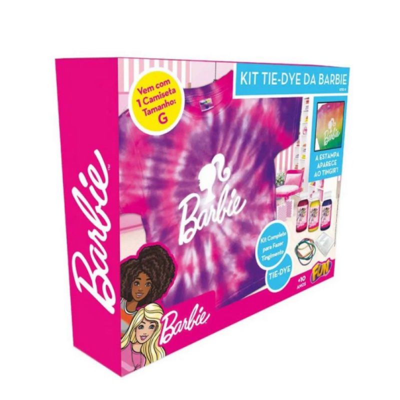 A nova moda Tie Dye voltou com tudo e com isso a Fun preparou um super e divertido kit Tie Dye da Barbie! As crianças poderão ser ainda mais fashion se inspirando na nova tendência, além de aflorarem a imaginação e criatividade! No kit vem a Camiseta com estampa da Barbie e acompanha 3 tintas (cores sortidas), luvas, forro e elásticos. A estampa da Barbie é revelada após o tingimento da camiseta.