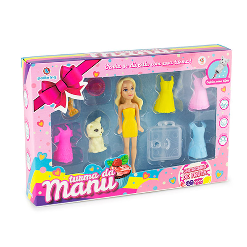 a Turma da Manu é composta por 4 amigas com cheirinhos de frutas, nesse kit você leva 1 delas, 4 vestidos para trocar o look, uma bolsinha, um anel para a criança e um bichinho de estimação