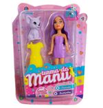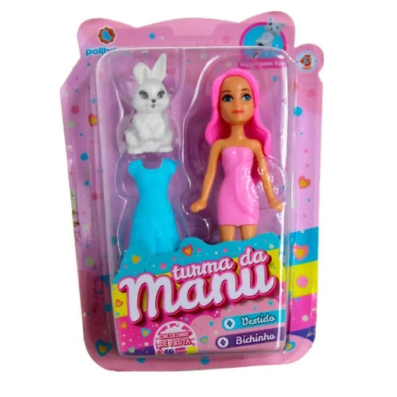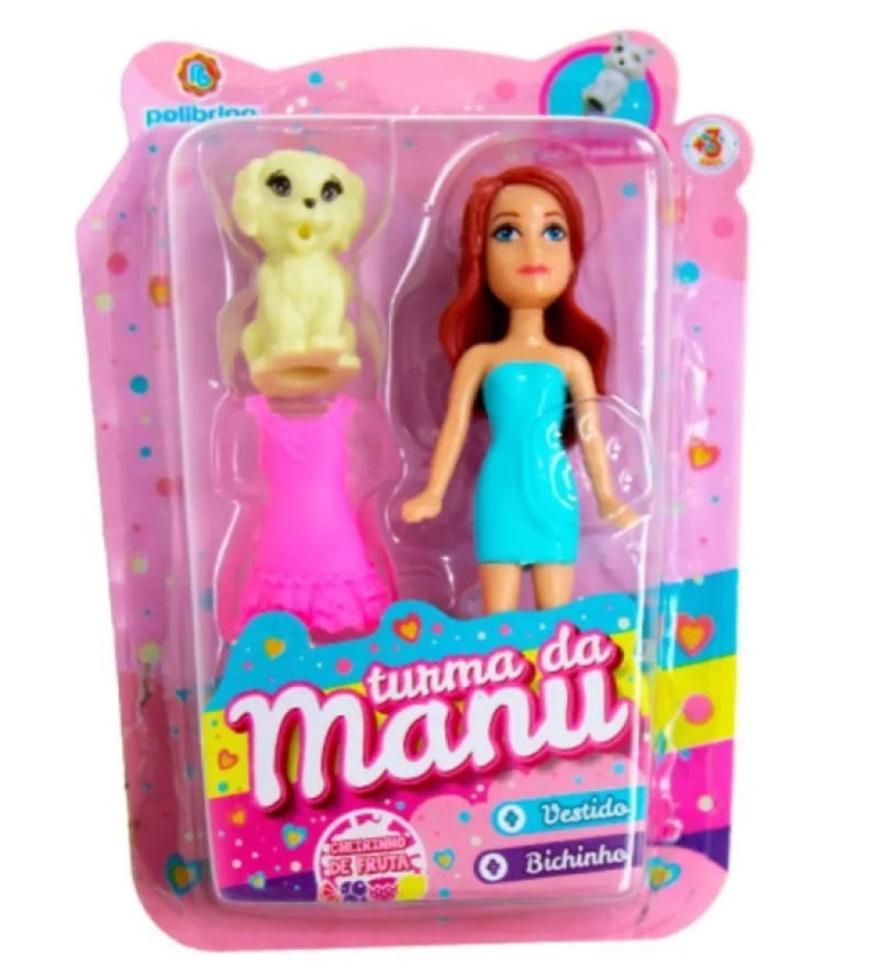 a Turma da Manu é composta por 4 amigas com cheirinhos de frutas, nesse kit você leva 1 delas, 1 vestido para trocar o look, e um bichinho de estimação, além do suporte para a boneca!