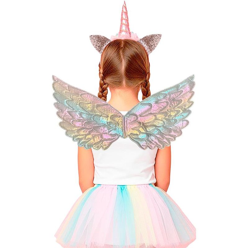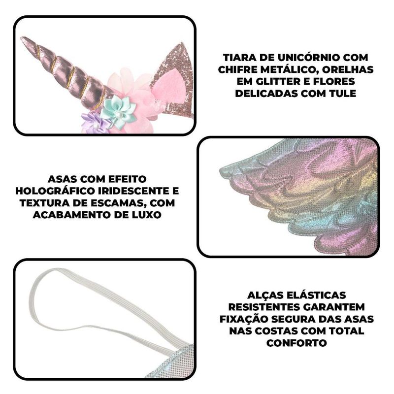 Transforme o dia da sua pequena em um mundo de magia com este encantador Kit de Acessórios de Unicórnio! Disponível nas deslumbrantes variações Colorido, Dourado e Prateado, este conjunto une brilho e sofisticação para festas de aniversário ou Carnaval. As asas possuem um efeito holográfico iridescente com textura de escamas, garantindo um visual de luxo e fixação segura através de alças elásticas confortáveis. A tiara exclusiva completa o visual com um chifre metálico, orelhas em glitter e delicadas flores de tule com pérolas, proporcionando um acabamento impecável em qualquer uma das cores escolhidas.Asas com efeito holográfico iridescente e textura de escamas Disponível nas cores: Colorido, Dourado e Prateado Tiara com chifre metálico, orelhas em glitter e flores de tule Alças elásticas resistentes que garantem fixação segura e conforto Material de alta qualidade com acabamento refinado de luxo Design leve e versátil para o uso prolongado em festas e eventos OBS: NÃO ACOMPANHA ROUPA E SAPATOS.
