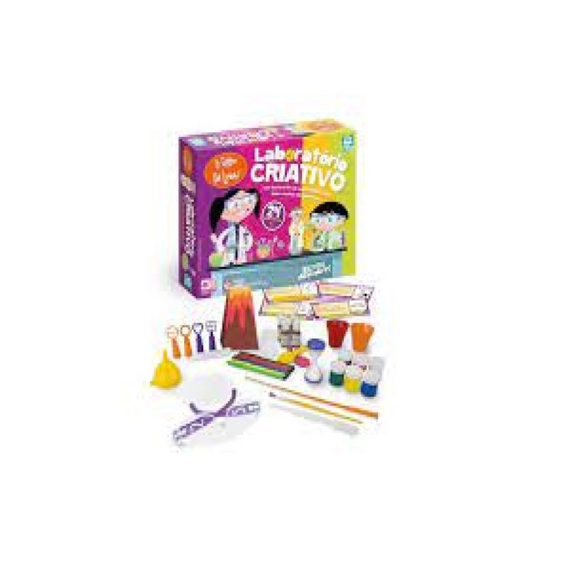 contém: 1 Estante de Eva, 2 Tubos de Ensaio, 1 Pipeta, 4 Corantes, 1 Copinho Plático, 2 Bexigas, 1 Óculos de Proteção, 1 Funil, 1 Cartão de Atividades, 24 Fichas, 6 Guaches, 1 Pincel, 1 Ampulheta, 1 Vareta, 1 Kit Bolhas, Canetinhas Coloridas, 3 Folhas de Papel Filtro Redondo e 2 Vasinhos.