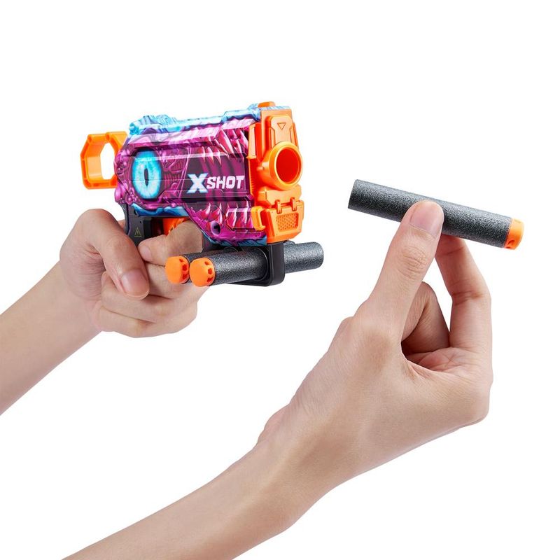 O Lançador X-Shot Skins Menace tem potência suficiente para enfrentar alvos a 27m de distância! Fácil de recarregar, vem com armazenamento de dardo inferior para uma recarga rápida no meio da batalha. O lançador X-Shot Skins Menace vem em 7 skins com estampas exclusivas e de alta qualidade para selecionar e colecionar e vem com 8 dardos de espuma. O lançador é compatível com os principais dardos do mercado. A brincadeira será muito mais divertida com o X-Shot Menace Skins!