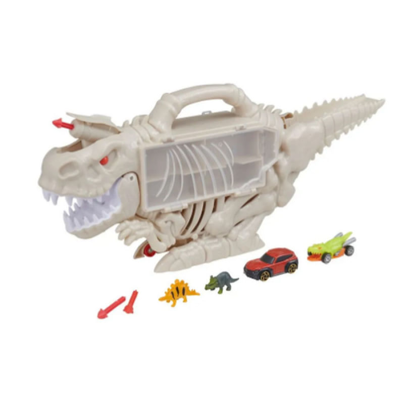 aventura começa agora! Em formato de esqueleto de dinossauro, o Fun Lançador Destruidor de Dinossauro é um playset radical que armazena até 8 carrinhos e traz rampas de lançamento, mísseis e diversos acessórios para criar cenários de pura ação.