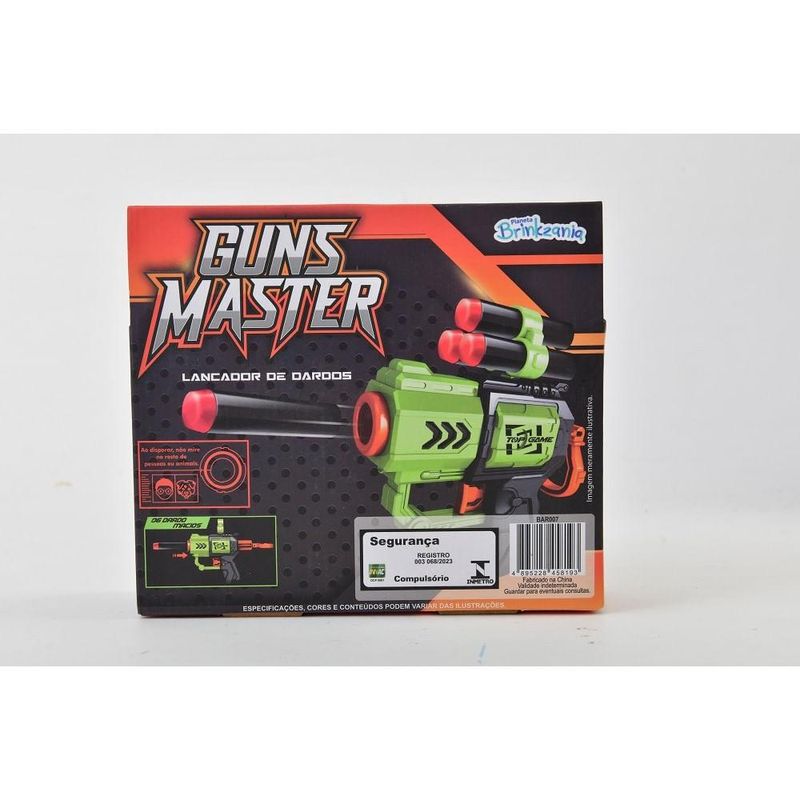 Lançador Guns Master com 6 Dardos - Brinkzania Embarque nessa aventura cheia de ação! Com o lançador Guns Master você tem um mundo de possibilidades e brincadeiras para explorar junto à seus amigos e familiares. Selo Inmetro: CE-BRI/INNAC-02478-04A