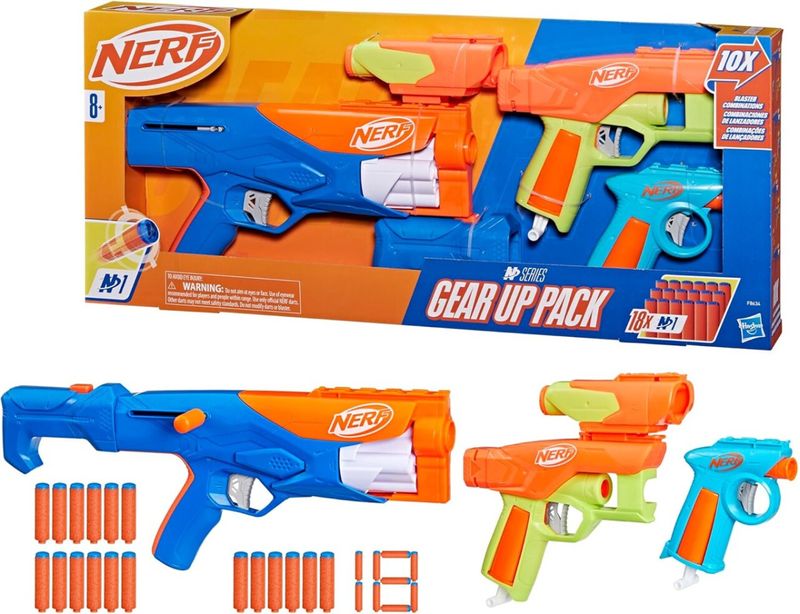 -Nerf N Series Kit Gear Up, 3 lançadores, 18 dardos Nerf N1 compatíveis apenas com os lançadores Nerf N Series DARDOS E LANÇADORES