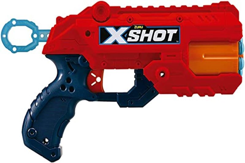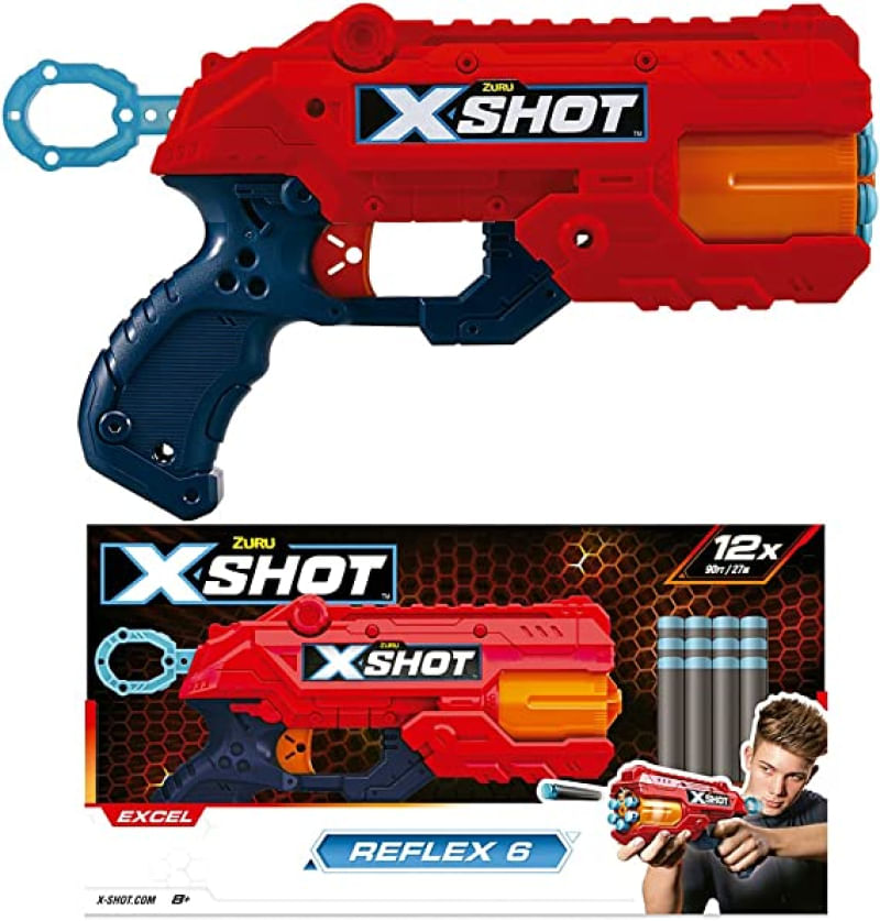 Lança dardos de espuma X-Shot. Acompanha 1 lançador de 6 tiros e 8 dardos de espuma.