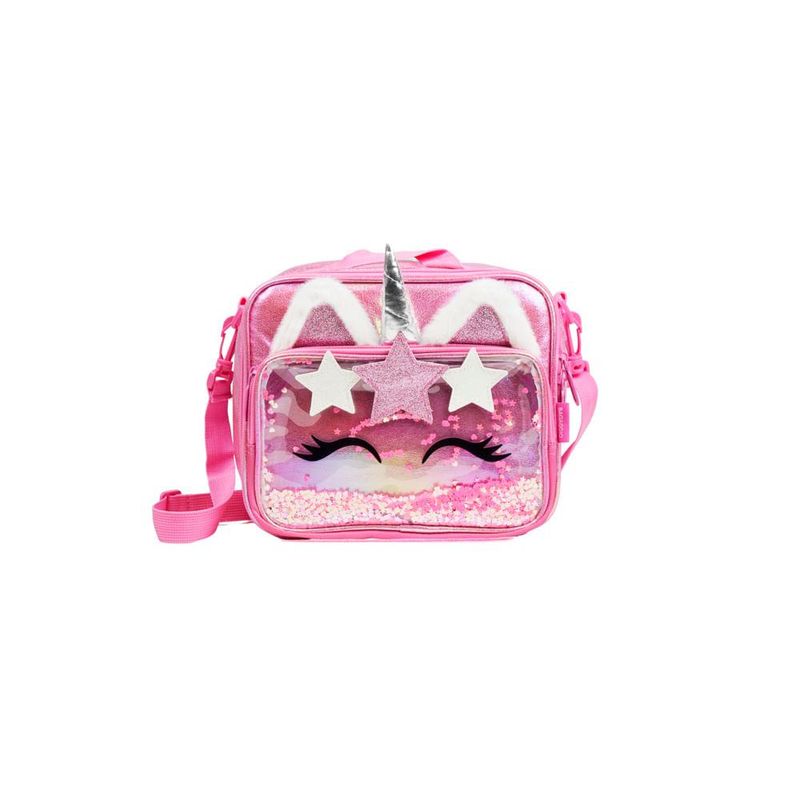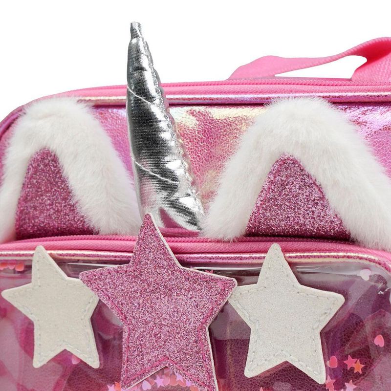 O modelo se destaca pelo bolso frontal em PVC com confete de estrelas, que cria um efeito superdivertido, além da petelequeira de estrela com glitter, das orelhinhas com pelúcia e do chifre fofinho de unicórnio — um visual único dentro do mix infantil Bagaggio.Organização e Espaço InternoA lancheira tem espaço pensado para levar lanche completo: potinho, frutas, suco, garrafa pequena e talheres. O revestimento interno é ideal para manter temperatura por mais tempo, cuidando melhor dos alimentos ao longo da rotina escolar.