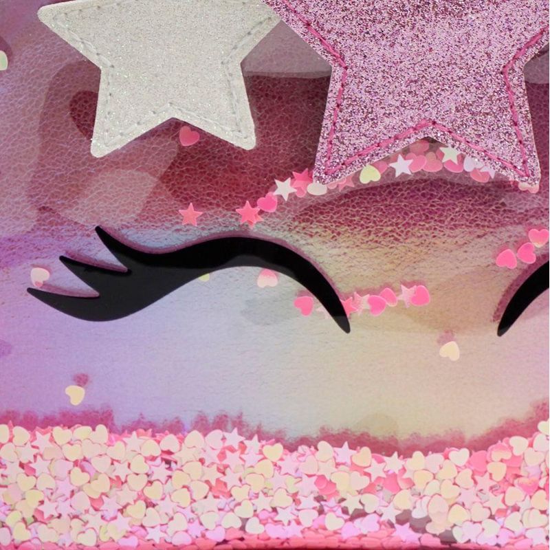 - Bolso frontal em PVC com confete de estrelas.