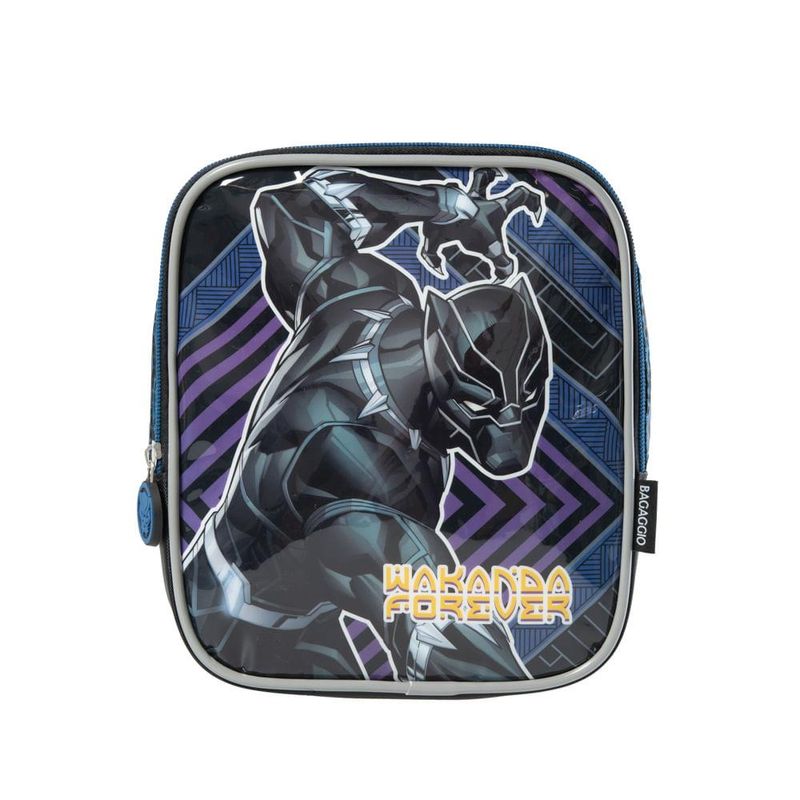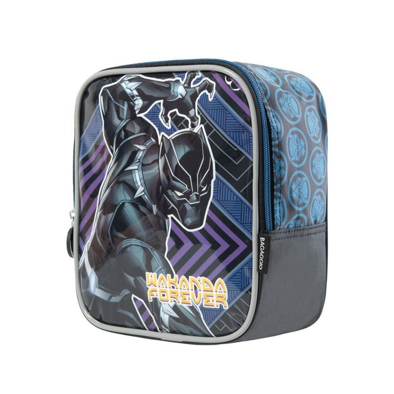 Com a Lancheira Pantera Negra a hora do lanche da criança vai ficar muito mais divertida. Feita em poliéster, material bastante resistente e durável, o modelo tem um estilo mochilinha, com alças ajustáveis às costas, além de alça carona, que pode ser acoplada no carrinho da mochila para facilitar o transporte. Possui amplo espaço interno com forro térmico impermeável, que ajuda a preservar a temperatura do lanche até a hora do recreio, bem como um elástico para prender a garrafinha.
