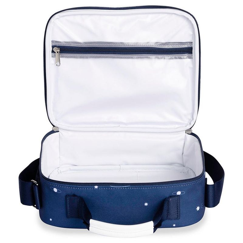 LANCHEIRA MASTERBAG ESPAÇO A Lancheira Térmica perfeita para a hora do lanchinho existe e é a Lancheira Kids! Internamente ela é revestida por uma manta térmica que deixa o ambiente adequado para guardar frutas, biscoitos, alimentos e suquinhos da sua menininha. Possui um bolso com fechamento com zíper para organizar garfos, colheres, paninhos e babadores. Seu tamanho é ideal para levar para a creche, piqueniques ou almoços em família. Características Principais: Composição: Lona 100% Poliéster com dublabem em algodão. Dimensões: 22 x 26 x 9cm. Garantia contra defeitos de fabricação.