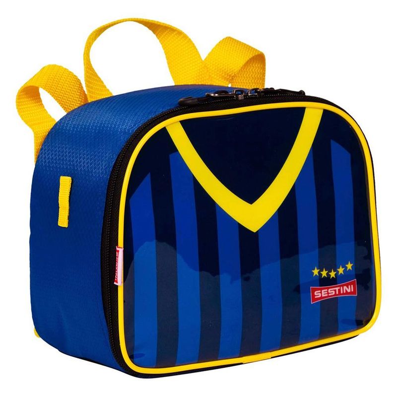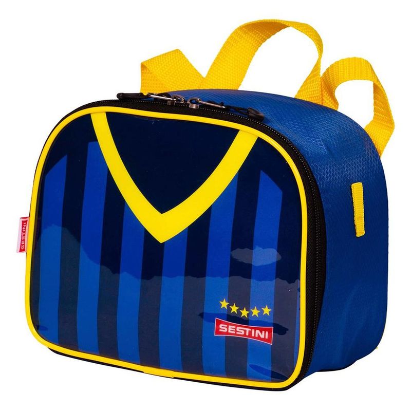 LANCHEIRA PEQUENA SESTINI 2 EM 1 20Y FUTEBOL A Lancheira Pequena 2 em 1 Sestini 20Y Futebol chegou com tudo! Preparados para essa nova partida? Produzida em poliéster, material muito resistente e painel frontal em PVC, que facilita a limpeza do produto. Possui sistema de alça carona onde você poderá acoplar à sua mochila de rodinhas, facilitando o transporte e fechamento por zíper, possui também identificador no verso para colocar seu nome e ainda acompanha Garrafinha e Potinho. Características Principais: Dimensões: 17 x 21 x 12 (AxLxP). Volume: 4,28 Litros. Peso: 180 Gramas. Composição: Poliéster e PVC. Garantia contra defeitos de fabricação.