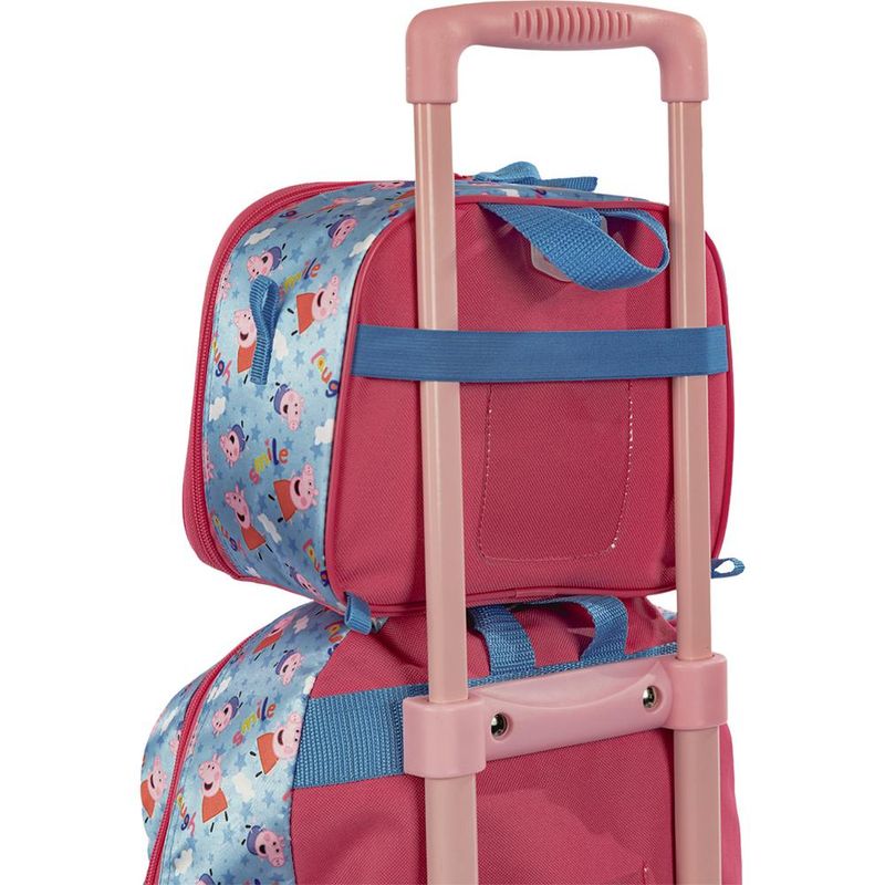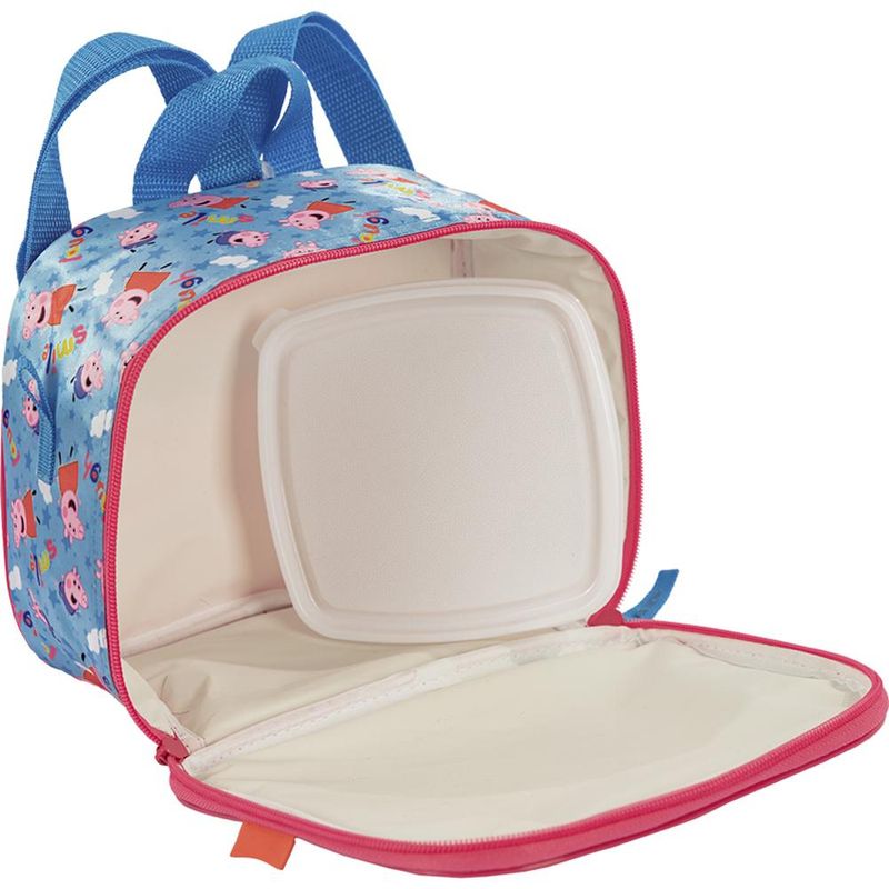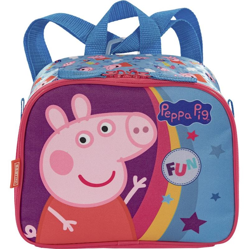 LANCHEIRA ESCOLAR SESTINI PEPPA 2X1 M PLUS CORE Lancheira escolar com tag identificador, acompanha potinho, alça carona, interior resistente a liquidos e etiquetas personalizadas. Características Principais: Dimensões: 22 x 18 x 11 (LxAxP). Volume: 04 Litros. Garantia contra defeitos de fabricação
