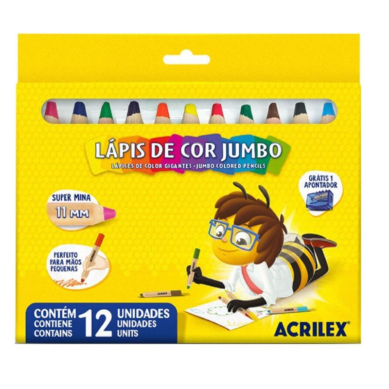 Quer ter uma experiência artística confortável? Com o Lápis de Cor Jumbo da Acrilex você consegue! A caixa vem com 12 ótimas e pigmentadas cores e um apontador que vai tornar suas artes lindas. O lápis de cor Jumbo tem uma empunhadura de 11cm que possibilita o encaixe perfeito em mãos pequenas de forma confortável.