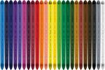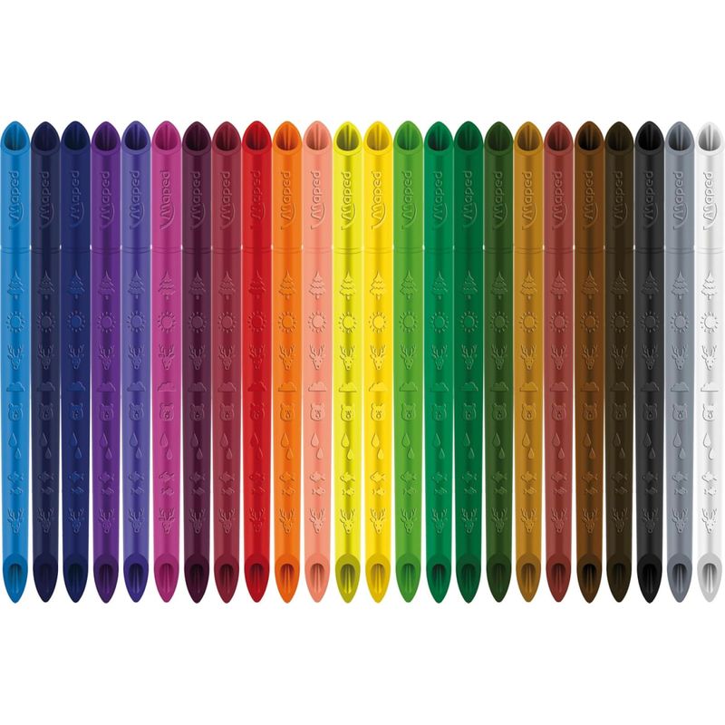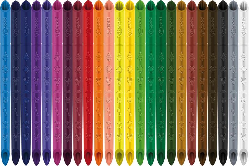 Lápis triangular para uma melhor aderência. Design original e patenteado que permite às crianças colorir em ambos os lados. Dê ao seu filho uma caixa de 24 lápis que duram muuuito mais!