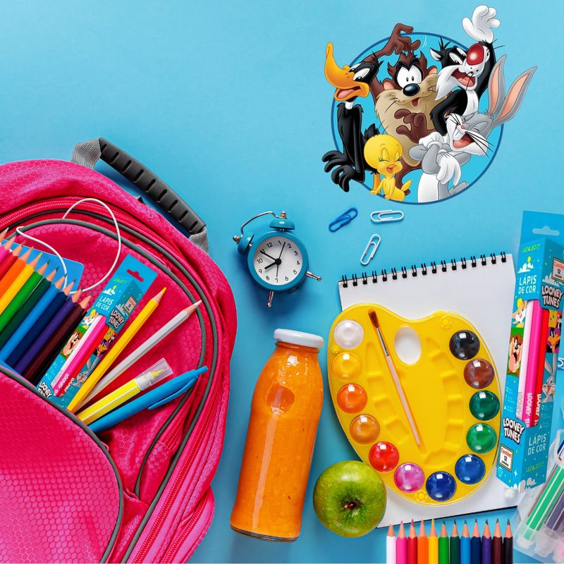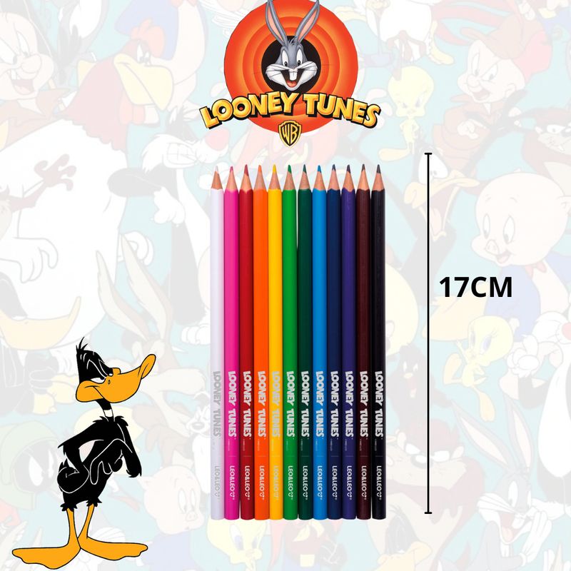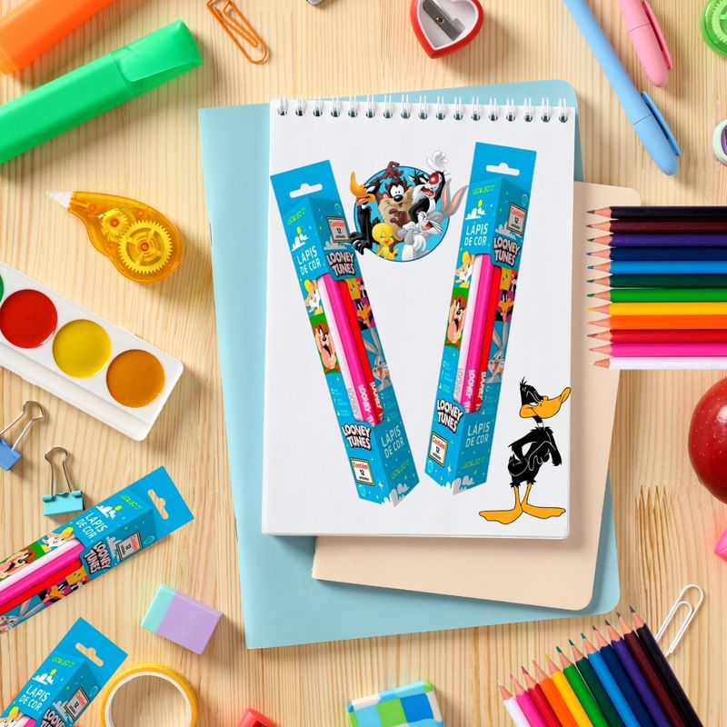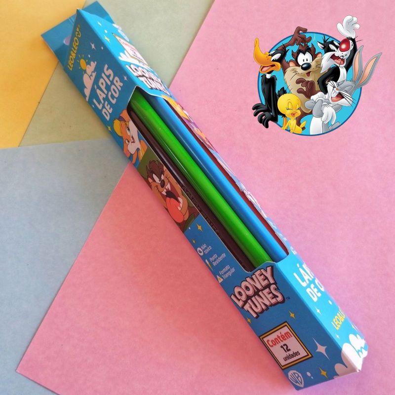 Temática Looney Tunes: Cada lápis é decorado com ilustrações dos personagens clássicos Looney Tunes, trazendo um toque de diversão ao material escolar.