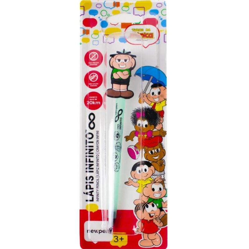 O Lápis Infinito da Newpen Turma da Mônica equivale a 100 lápis comuns e possui uma tecnologia que consegue comprimir 100 grafites em nano partículas de grafeno, que é um material mais resistente que o grafite natural.