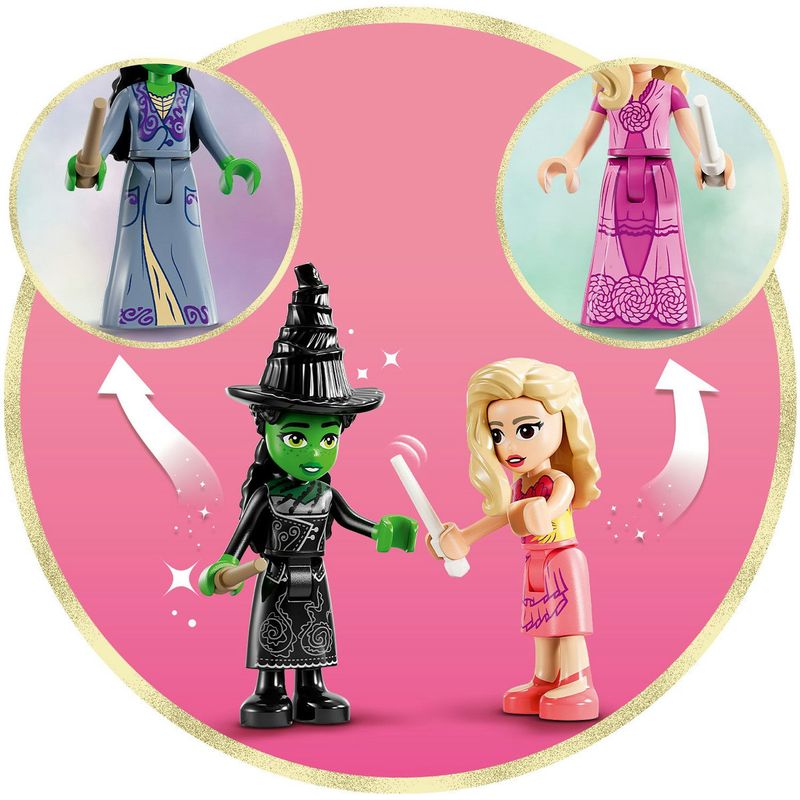 Desvende um mundo de magia do filme Wicked abrindo este baú para construir. Revele um momento mágico de amizade quando a Glinda promete tornar a Elphaba "popular". Leia o código QR escondido no conjunto para acessar o conteúdo exclusivo de LEGO® Wicked e o hit musical, pergunte a um adulto antes de entrar online! Faça as minibonecas dançarem pelo dormitório ao som da música, como no filme.