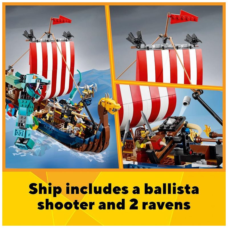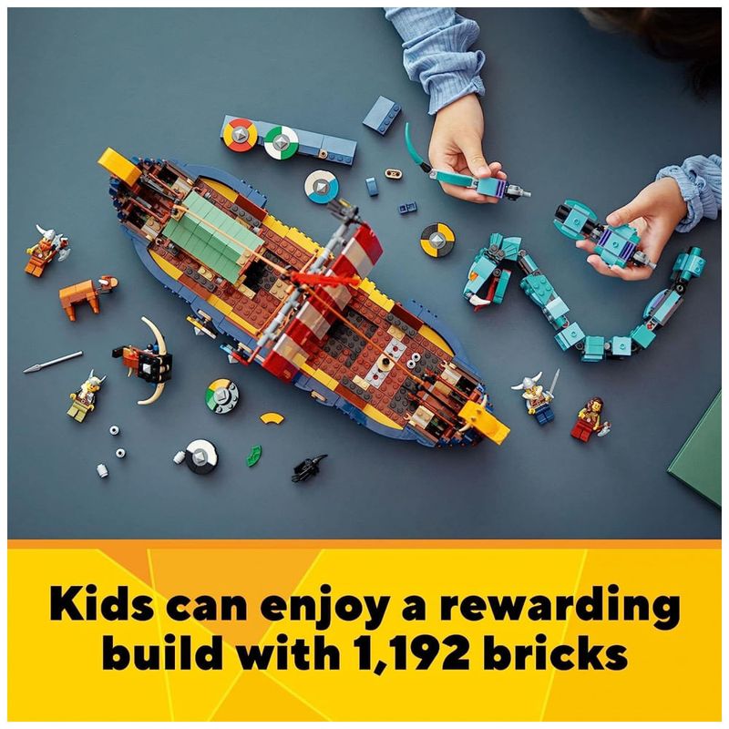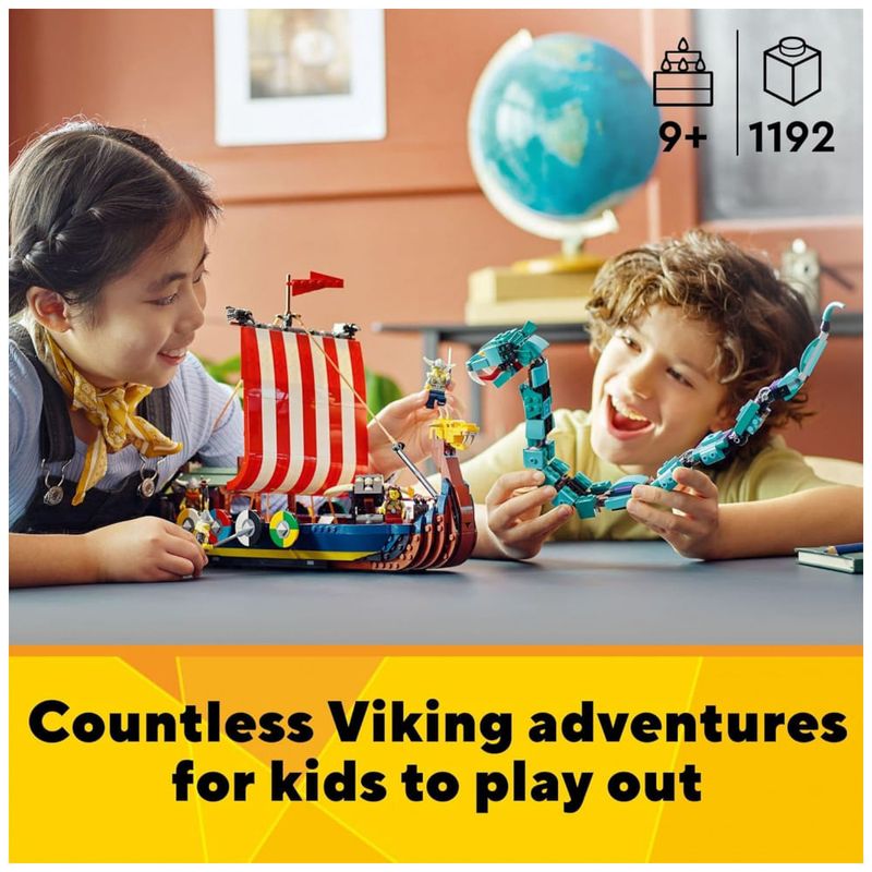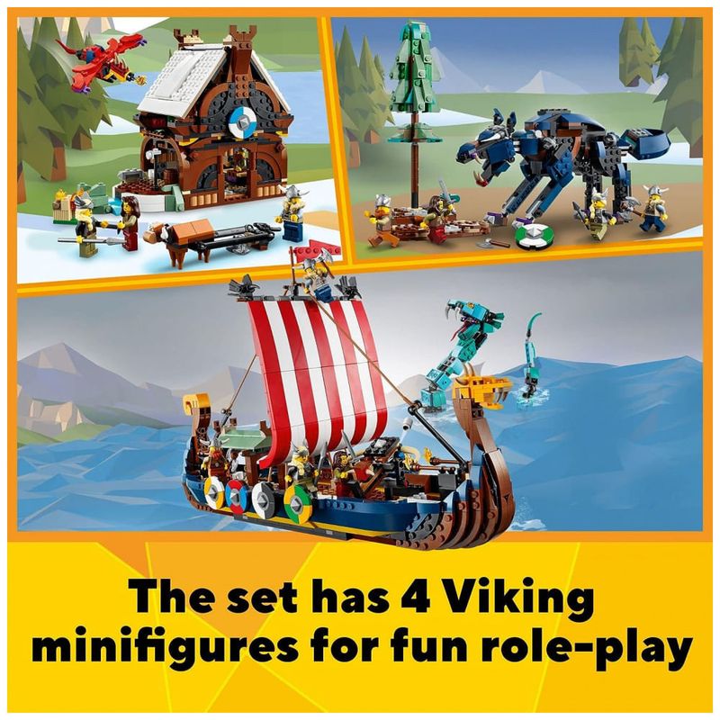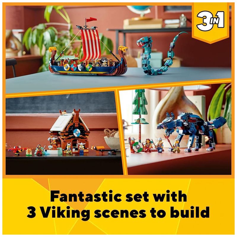 3 brinquedos Viking em 1 conjunto As crianças vão adorar este conjunto LEGO Creator 3 em 1 Viking Ship e Midgard Serpent 31132, com um Viking Ship, uma casa Viking e um brinquedo de lobo Fenris.