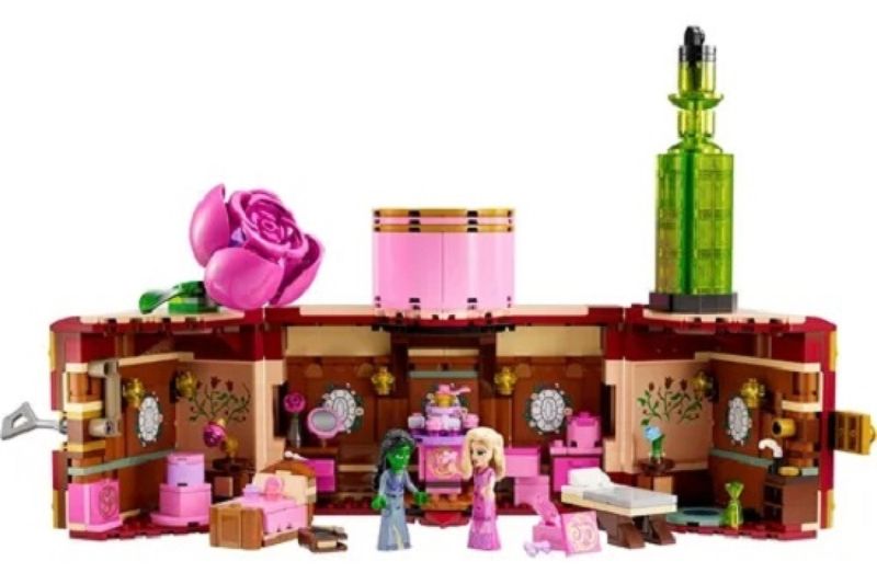 Este brinquedo modelo consiste em um lindo baú montável que se abre para um detalhado conjunto de casa de bonecas do quarto das meninas na Universidade Shiz. Cheio de acessórios autênticos, este conjunto de casa de bonecas permite que as crianças recriem a cena em que Glinda promete tornar Elphaba "popular". Assim como no filme, as 2 mini-bonecas usam pijamas, mas também há 2 roupas diurnas para diversão extra de vestir.