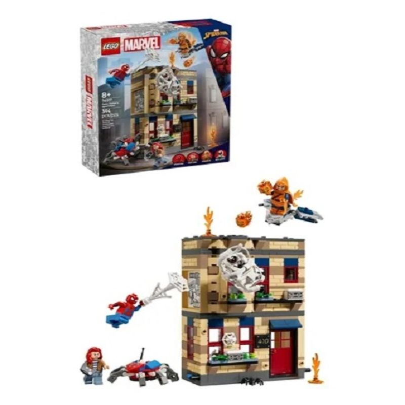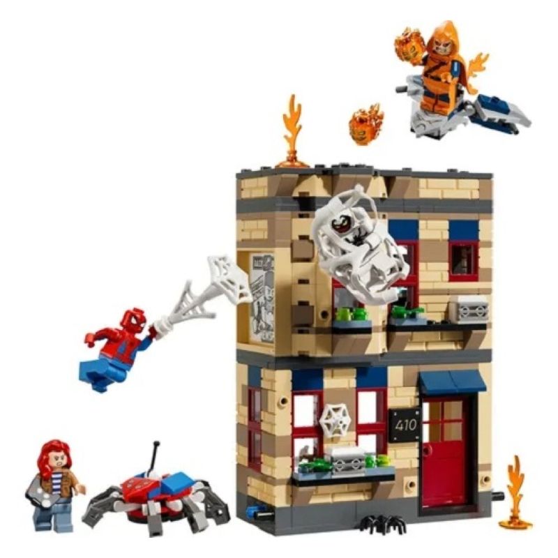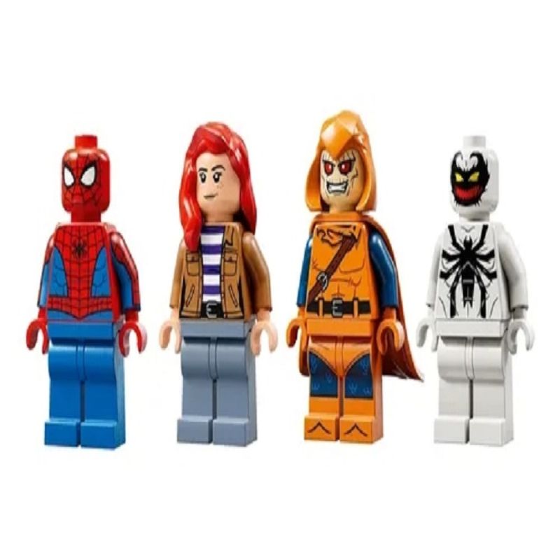 O conjunto montável contém 4 minifiguras: Duende Macabro em seu planador com bombas de abóbora; Homem-Aranha e Anti-Venom lançando teias; e Mary Jane com um robô-aranha articulado. Uma teia gigante e flexível presa ao prédio pode prender uma minifigura. No primeiro andar do apartamento, há uma cozinha. O andar superior tem um escritório e um quarto com uma cama dobrável, escrivaninha, computador, câmera e um microscópio. Um botão de pressão faz com que parte do prédio desmorone. As crianças podem conectar este conjunto de construção e brincadeira ao Homem-Aranha vs. Oscorp (76324) e empilhá-lo sobre o Homem-Aranha no Aranhaverso: Miles Morales vs. O Ponto (76311) para uma experiência de jogo ainda maior. Contém 394 peças.