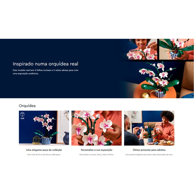 Lego Botanical Orquidea 10311 com 608pcsDesfrute de um projeto de construção significativo e crie uma bela exposição de plantas para sua casa com o projeto modular LEGO® Orquídea (10311) para adultos. Dedique seu tempo para elaborar todos os detalhes das flores brancas e cor-de-rosa e do vaso. Inspirado por uma orquídea real, o modelo apresenta 5 folhas na base e 2 raízes aéreas para uma exposição autêntica. Construa o vaso azul com textura canelada e preencha-o com elementos LEGO castanhos para recriar a mistura de casca onde uma orquídea real cresceria.Marca: LEGO