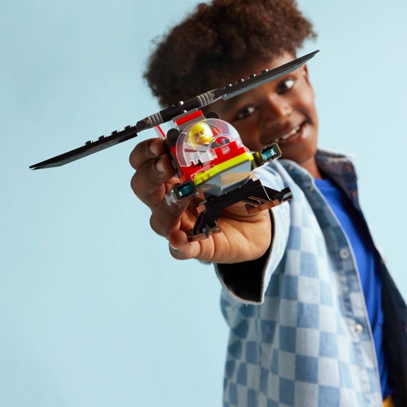 O que há neste conjunto de construção? – Inclui tudo o que as crianças precisam para construir um helicóptero de resgate de incêndio e uma minifigura de piloto de bombeiro