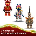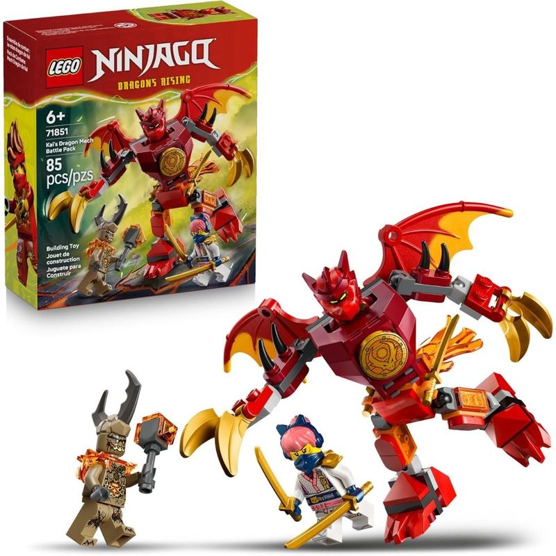 Meninos, meninas e fãs da série NINJAGO Ascensão dos Dragões maiores de 6 anos desfrutarão de horas de brincadeiras imaginativas com o conjunto de construção LEGO NINJAGO Pack de Combate Dragão Meca do Kai (71851). Este conjunto inclui um meca dragão com pernas, asas grandes, garras e um tronco articulável que gira em 360 graus, além de um cockpit para inserir uma minifigura. Este brinquedo ninja valioso também inclui três minifiguras: O Kai com duas espadas, o Sora com duas espadas e um Monstro da Terra com garras, que garantem horas de aventuras para crianças enquanto vivem cenas da 4ª temporada de NINJAGO Ascensão dos Dragões. A linha de conjuntos de construção e brinquedos de aventura LEGO NINJAGO para crianças incluem mecas, dragões e templos detalhados para muita ação incrível com ninjas. As crianças podem construir com confiança usando o aplicativo LEGO Builder, ampliando e girando em 3D e acompanhando seu progresso com instruções digitais fáceis de seguir. O conjunto contém 85 peças.