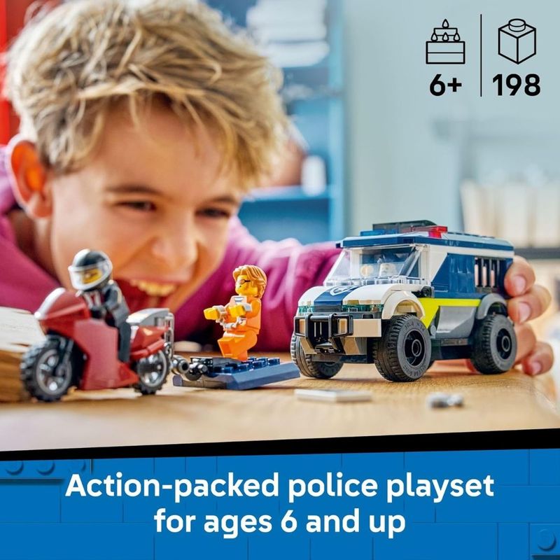 Prepare-se para aventuras de fugas eletrizantes com o conjunto de construção LEGO City Van de Transporte de Prisioneiros da Polícia (60479) para crianças maiores de 6 anos. O modelo de caminhão da polícia inclui uma cabine do motorista detalhada e cela com espaço para 2 bandidos. As crianças usam a motocicleta com corrente para fixar à porta da cela e puxá-la. Basta adicionar as minifiguras do policial e 2 bandidos para fugas épicas da prisão. Perfeito para crianças criativas e fãs de conjuntos LEGO City Polícia, este kit de construção de veículo policial é um ótimo presente em aniversários ou qualquer ocasião. Adicione este conjunto LEGO City a outros veículos de emergência (vendidos separadamente) para mais ação e histórias imaginativas. As crianças podem construir com confiança usando o aplicativo LEGO Builder, onde podem ampliar e girar em 3D, bem como acompanhar seu progresso com instruções digitais fáceis de seguir. O conjunto contém 198 peças.