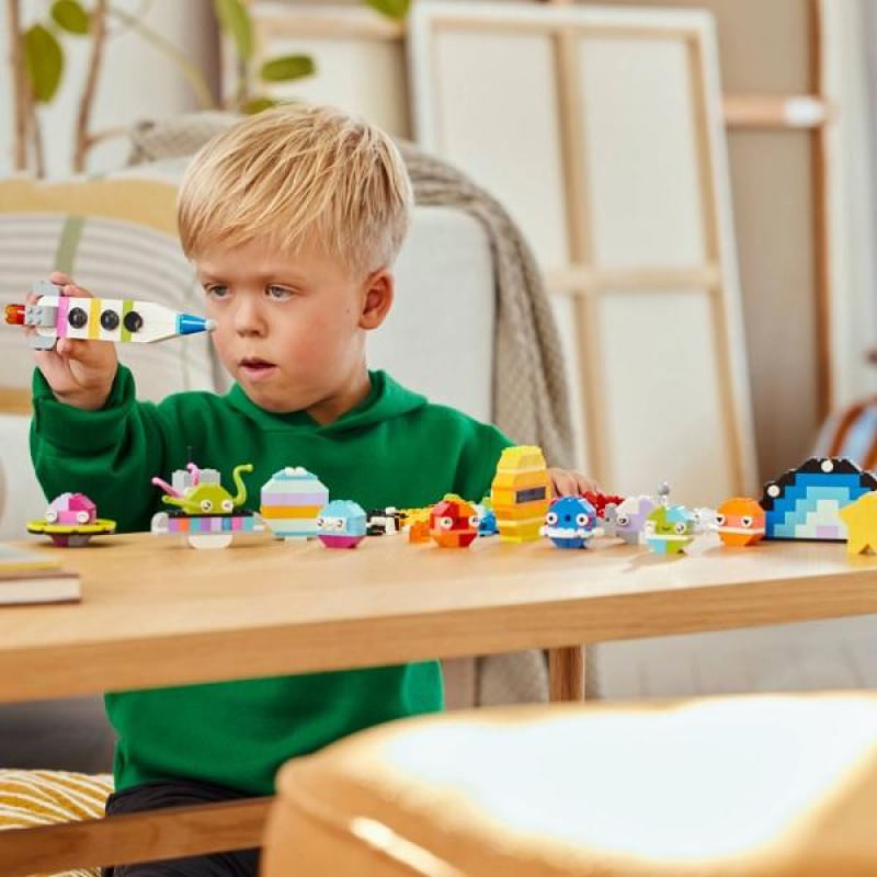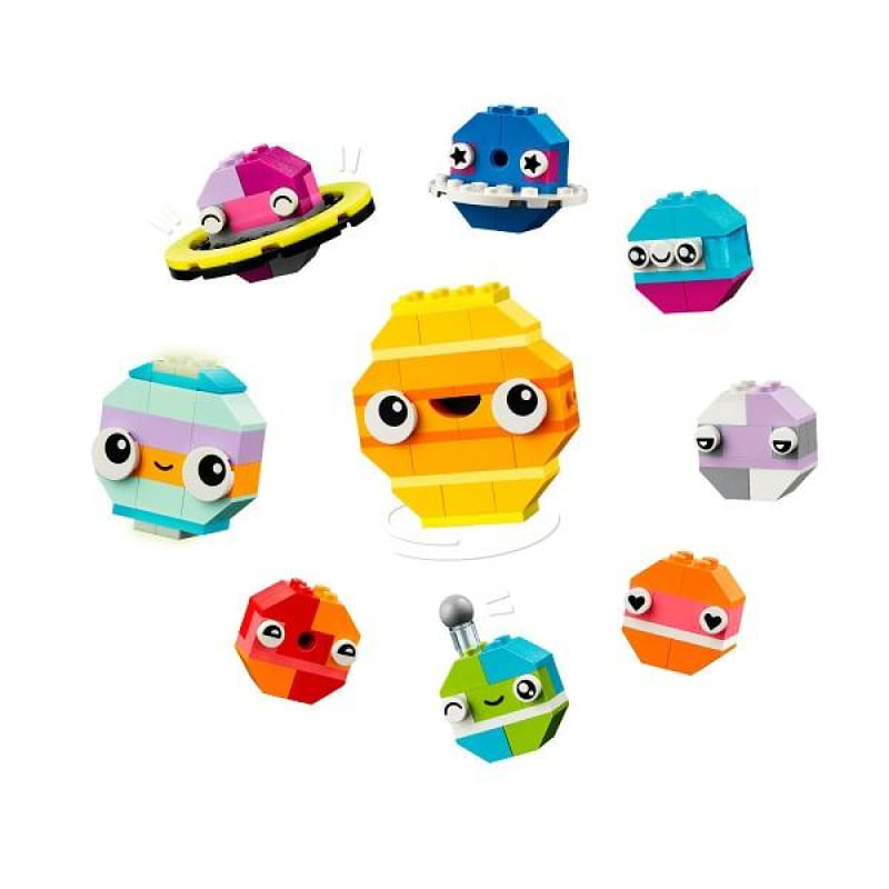 As crianças montam os tijolos coloridos para construir um foguete de brinquedo, um alienígena, um astronauta e um mini sistema solar incluindo Marte, a Terra, o Sol e Saturno com seus anéis. Os modelos espaciais podem então ser personalizados usando cores, formas, olhos, expressões alternativas e um suporte que permite girar o modelo.