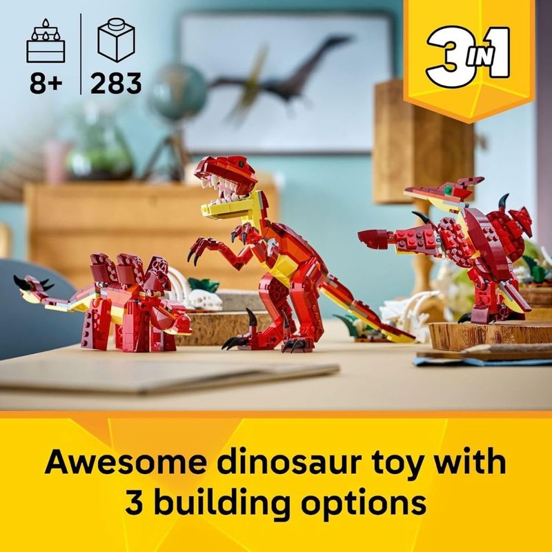 Este conjunto de construção LEGO Creator 3em1 Dinossauro Feroz (31379) dá às crianças 8 anos e tudo o que precisam para desfrutar de aventuras pré-históricas infinitas. Este conjunto de dinossauro maneiro e detalhado oferece três opções de construção diferentes com as mesmas peças. Meninos e meninas podem escolher construir um Velociraptor com uma mandíbula, cabeça, braços, pernas e cauda articuláveis. Isso pode ser reconstruído em um brinquedo de Estegossauro que move seu pescoço, cabeça e pernas ou um Pterossauro com asas, cabeça e pés articuláveis. Cada modelo também inclui uma caveira de dinossauro e caixa torácica, ovos de dinossauro e uma planta. Após a brincadeira, cada modelo pode ser exibido como decoração de sala de dinossauros para meninos e meninas compartilharem com a família. Este conjunto LEGO Creator 3em1 inspirará a imaginação das crianças e é um ótimo presente de dinossauro. E com o aplicativo LEGO Builder, as crianças podem viver uma grande aventura de construção. Elas podem ampliar e girar seus conjuntos com instruções de construção em 3D e acompanhar seu progresso. Os modelos não podem ser construídos simultaneamente. O conjunto contém 283 peças.