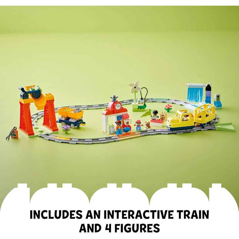 Crianças pré-escolares com mais de 3 anos embarcam em uma jornada de imaginação com o conjunto Big Interactive Community Train (10428) para crianças pequenas. Cheio de recursos e funções e incluindo 4 figuras diversas, este conjunto de ação completa proporciona horas de aprendizado imersivo. A jornada de aprendizado das crianças começa na estação de trem do conjunto de brinquedos. Crianças em idade pré-escolar usam o pensamento criativo para traçar uma rota para o trem de passageiros de brinquedo Push&Go, assumindo tarefas divertidas de resolução de problemas conforme avançam. Elas podem carregar o trem com carga, carregar a locomotiva ou lavar os vagões. Cada atividade ganha vida com luzes e sons quando o trem de brinquedo passa sobre um dos 5 tijolos de ação. Este conjunto também ajuda a desenvolver paciência e curiosidade enquanto as crianças experimentam novas maneiras de construir seus trilhos de trem. O aplicativo gratuito LEGO® DUPLO® Interactive Trains permite que as crianças gravem seus próprios sons para a viagem do trem e conduzam a locomotiva usando um dispositivo eletrônico portátil, além de dar às famílias inspiração para construções alternativas. Conjunto de trem extenso para crianças de 3 anos ou mais – O brinquedo Big Interactive Community Train vem com vagões que se conectam, áreas para lavar e carregar o trem, um prédio de estação e 16 peças de trilhos Bonecos de brinquedo para dramatização criativa
