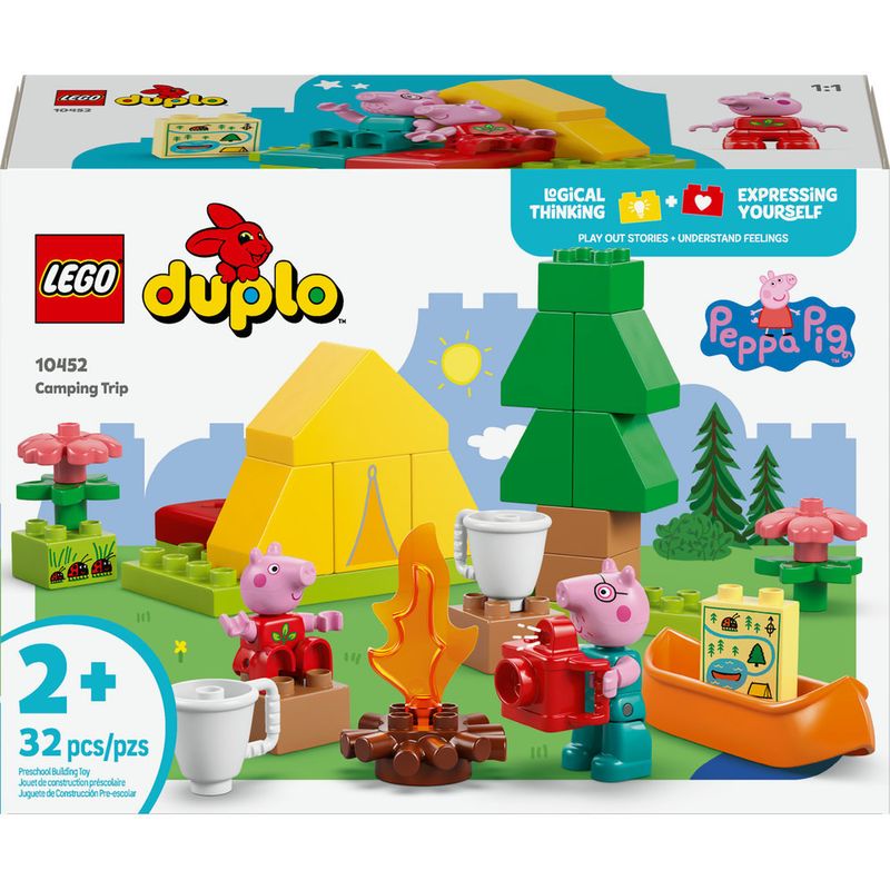 Os pequenos embarcam em uma aventura com o conjunto de construção LEGO DUPLO Peppa Viagem de Acampamento (10452). Através de brincadeiras criativas, os pré-escolares podem explorar como se sentem sobre primeiras experiências brincando de faz de conta acampando com a Peppa e o Papai, para depois explorar o rio na canoa.