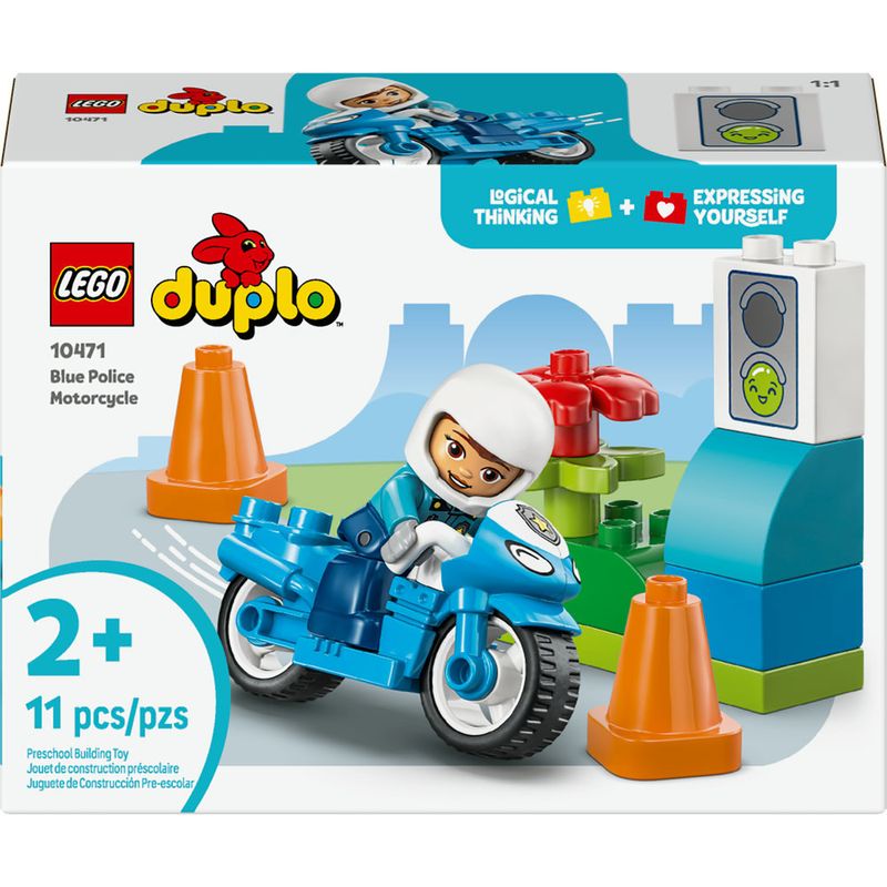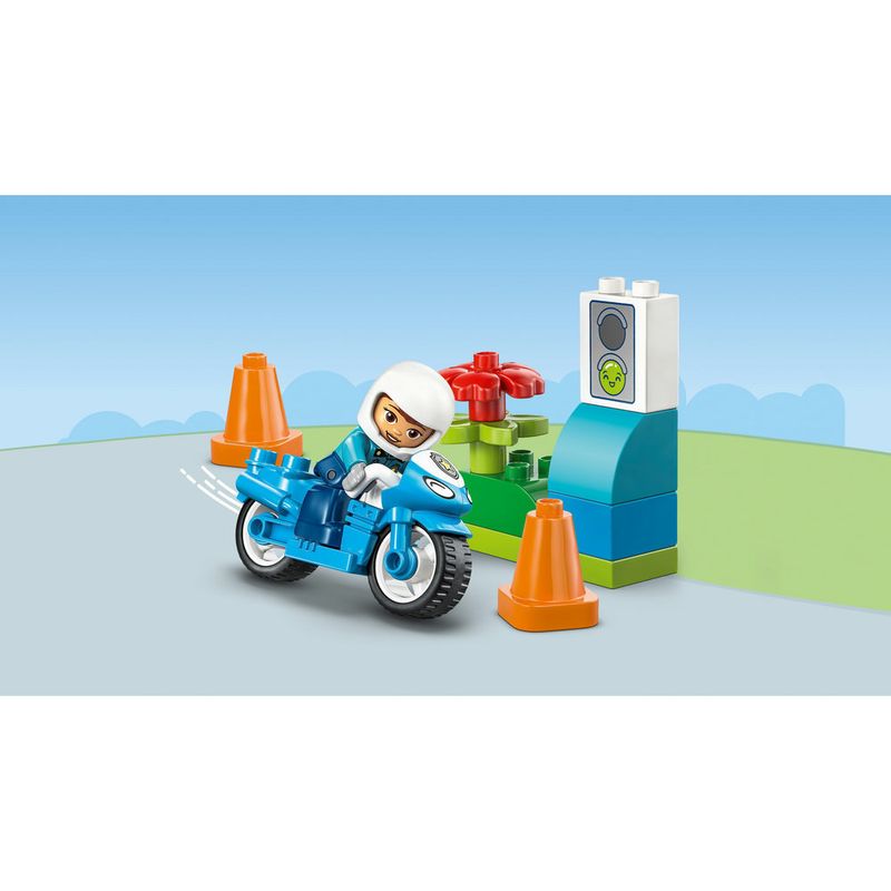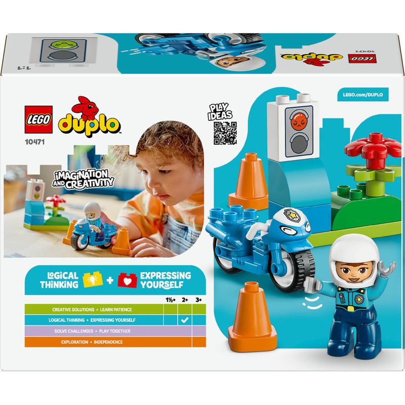 Com suas grandes peças coloridas, histórias divertidas e personagens diversos, os conjuntos LEGO DUPLO são feitos para ativar a curiosidade natural dos pequenos para ajudá-los a alcançarem seus marcos de desenvolvimento. Este brinquedo educativo os permite treinar a coordenação motora fina enquanto colocam a policial LEGO DUPLO na motocicleta e a guiam pelos cones. Com o semáforo, os pais podem ensinar seus pequenos motoristas que o vermelho é pare e o verde é passar sim, sim, sim! Contém 11 peças.