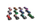 - Cada modelo de carro de brinquedo vem nas cores de uma equipe de F1, com logotipos de equipe, um grande capacete no cockpit e rodas móveis para os fãs de F1 encenar corridas emocionantes.