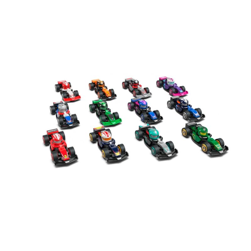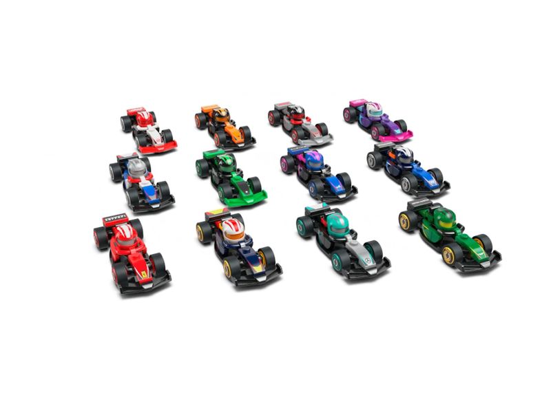 - Há 1 carro de corrida colecionável LEGO F1 surpresa em cada kit de veículo e um total de 12 para colecionar: um carro de F1, um carro da F1 ACADEMY e 10 carros das equipes de Fórmula 1: RB20, Mercedes-AMG, Ferrari, McLaren, Aston Martin, Alpine, Williams, VCARB, Sauber e Haas.