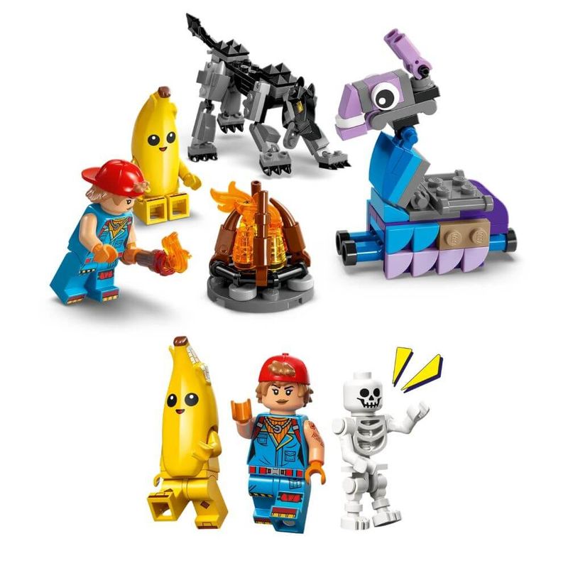 Faça a alegria dos jogadores com este conjunto LEGO® Fortnite® Acampamento de Embananado e Faísca (77075) para crianças maiores de 7 anos. Repleto de elementos reco e personagens icônicos, o conjunto de videogame incentiva os fãs a criar sua própria aventura com LEGO Fortnite. O conjunto recria os primeiros desafios que os jogadores encontram no jogo LEGO Fortnite Odyssey, e as crianças se divertirão construindo o acampamento, bancada de criação e ruínas que podem ser desconstruídas e reconfiguradas. Ele também inclui uma figura da Lhama de Suprimentos e um lobo com cauda e pernas móveis. A ação ganha vida com as minifiguras de Embananado, Faísca e um esqueleto, que contam com armas para incentivar brincadeiras. Um ótimo presente de videogame para crianças e jogadores de todas as idades, este conjunto desbloqueia um bônus no jogo LEGO Fortnite na forma um Traje especial de Faísca, que os construtores podem resgatar lendo o código QR na capa das instruções de construção. O conjunto contém 250 peças.