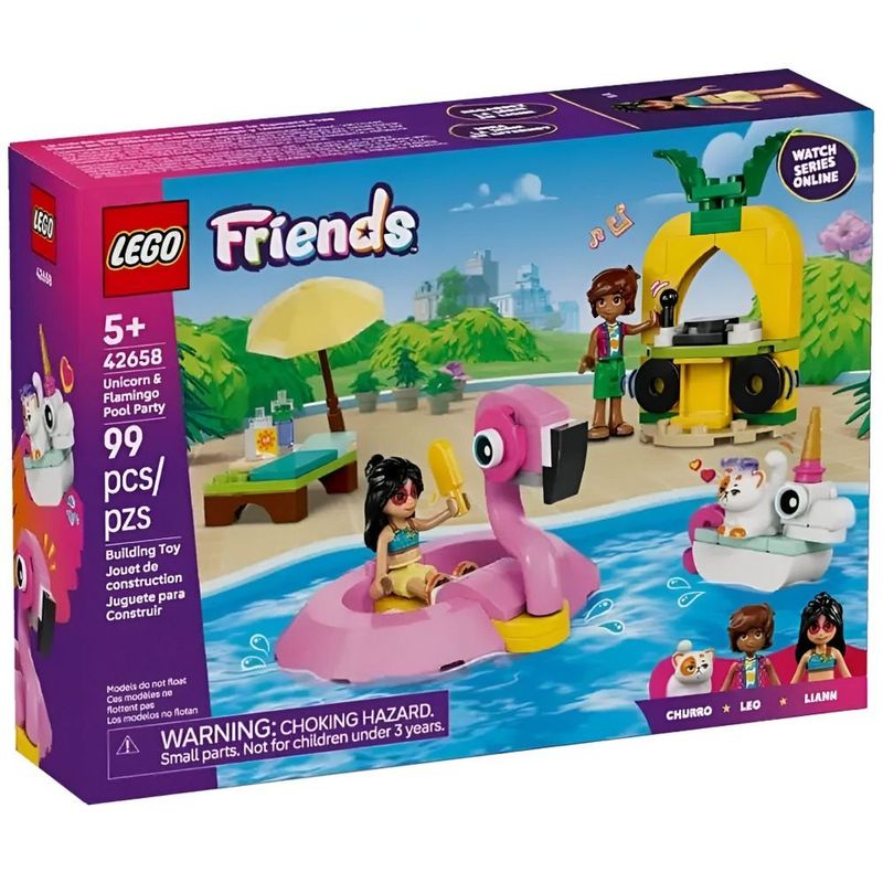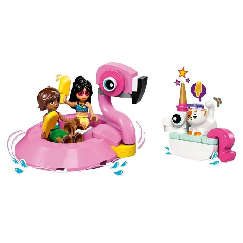 Este set de construção está cheio de oportunidades de brincadeira enquanto as crianças descobrem o LEGO Friends Festa na Piscina com Unicórnio e Flamingo (42658). Este set inclui 2 insufláveis, acessórios de piscina, 2 mini bonecos LEGO Friends e figura de gato.