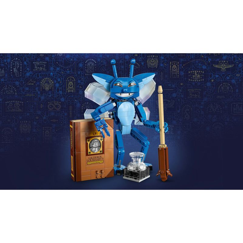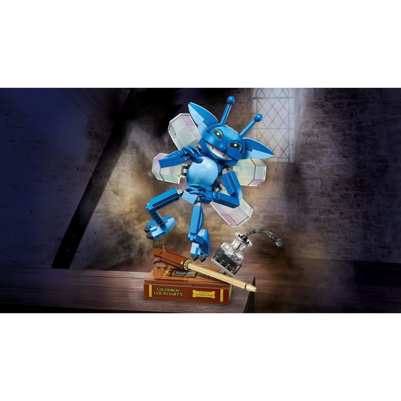 Coloque a Diabrete da Cornualha em posição de voo no expositor transparente, ou coloque-a em pé e brinque com ela. Este brinquedo de construção para crianças também inclui acessórios icônicos: exiba a figura da Diabrete da Cornualha com o livro montável do Gilderoy Lockhart e um frasco de tinta que está derramando.